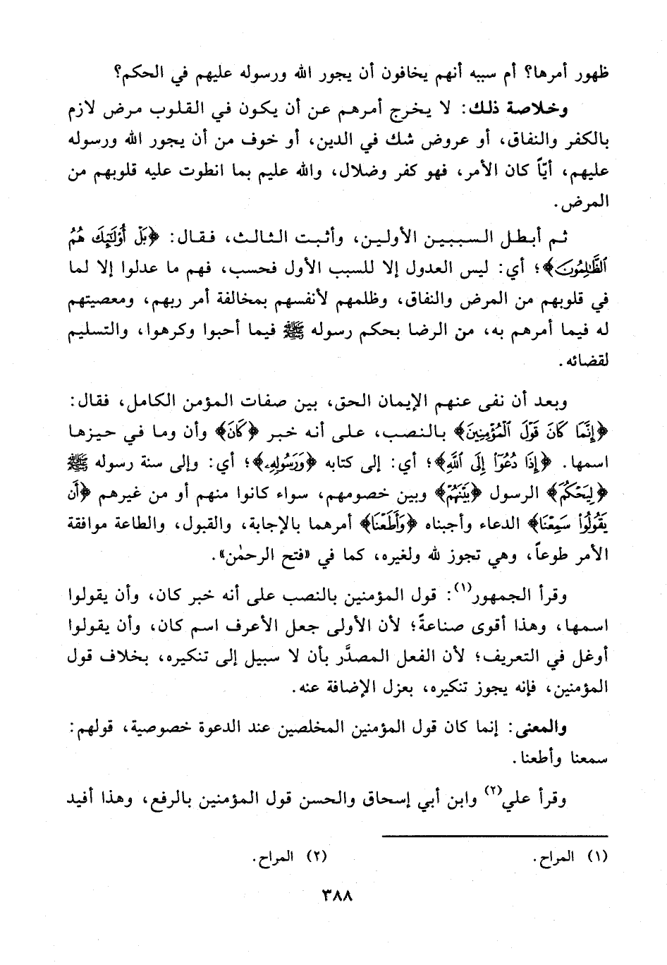 51 - وبعد أن نفى عنهم الإيمان الحق، بين صفات المؤمن الكامل، فقال: {إِنَّمَا كَانَ قَوْلَ الْمُؤْمِنِين} بالنصب، على أنه خبر {كَانَ} وأن وما في حيزها اسمها. {إِذَا دُعُوا إِلَى اللَّهِ}؛ أي: إلى كتابه {وَرَسُولِهِ}؛ أي: وإلى سنة رسوله - صلى الله عليه وسلم - {لِيَحْكُمَ} الرسول {بَيْنَهُمْ} وبين خصومهم، سواء كانوا منهم أو من غيرهم {أَنْ يَقُولُوا سَمِعْنَا} الدعاء وأجبناه {وَأَطَعْنَا} أمرهما بالإجابة، والقبول، والطاعة موافقة الأمر طوعًا، وهي تجوز لله ولغيره، كما في "فتح الرحمن".