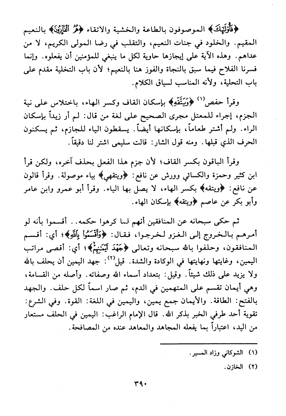 وقرأ الباقون بكسر القاف؛ لأن جزم هذا الفعل بحذف آخره، ولكن قرأ ابن كثير وحمزة والكسائي وورش عن نافع: {ويتقهي} بياء موصولة. وقرأ قالون عن نافع: {ويتقه} بكسر الهاء، لا يصل بها الياء. وقرأ أبو عمرو وابن عامر وأبو بكر عن عاصم {ويتقه} بإسكان الهاء.