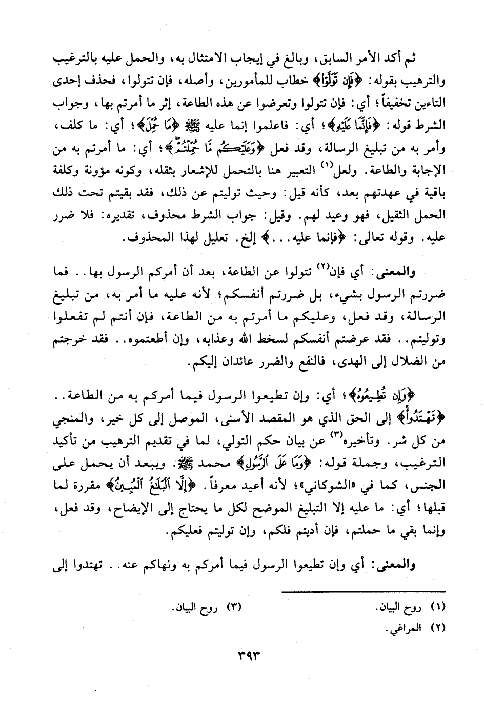 والمعنى: أي فإن (¬2) تتولوا عن الطاعة، بعد أن أمركم الرسول بها .. فما ضررتم الرسول بشيء، بل ضررتم أنفسكم؛ لأنه عليه ما أمر به، من تبليغ الرسالة، وقد فعل، وعليكم ما أمرتم به من الطاعة، فإن أنتم لم تفعلوا وتوليتم .. فقد عرضتم أنفسكم لسخط الله وعذابه، وإن أطعتموه .. فقد خرجتم من الضلال إلى الهدى، فالنفع والضرر عائدان إليكم.