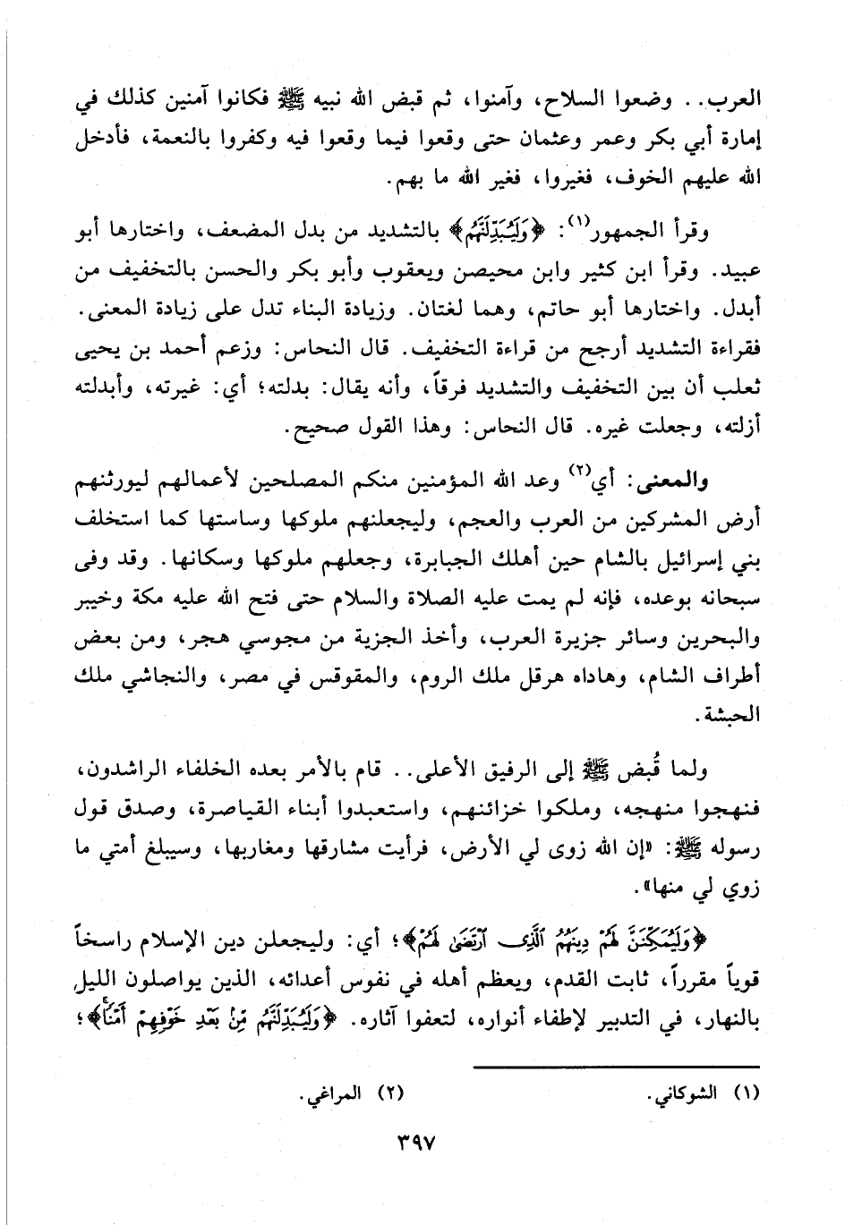 والمعنى: أي (¬2) وعد الله المؤمنين منكم المصلحين لأعمالهم ليورثنهم أرض المشركين من العرب والعجم، وليجعلنهم ملوكها وساستها كما استخلف بني إسرائيل بالشام حين أهلك الجبابرة، وجعلهم ملوكها وسكانها. وقد وفي سبحانه بوعده، فإنه لم يمت عليه الصلاة والسلام حتى فتح الله عليه مكة وخيبر والبحرين وسائر جزيرة العرب، وأخذ الجزية من مجوسي هجر، ومن بعض أطراف الشام، وهاداه هرقل ملك الروم، والمقوقس في مصر، والنجاشى ملك الحبشة.