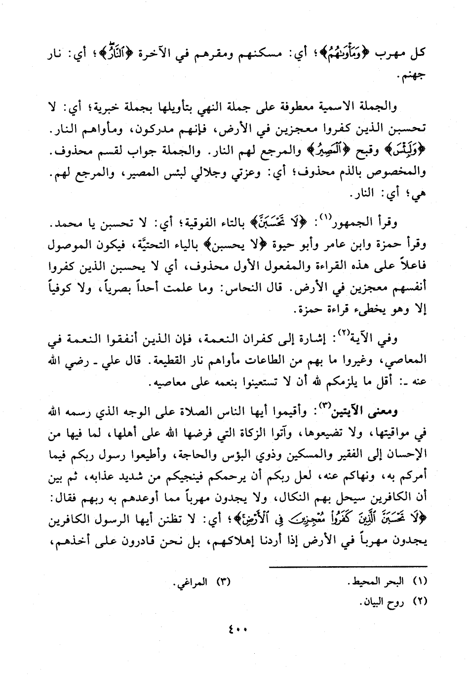 ومعنى الآيتين (¬3): وأقيموا أيها الناس الصلاة على الوجه الذي رسمه الله في مواقيتها, ولا تضيعوها، وآتوا الزكاة التي فرضها الله على أهلها , لما فيها من الإحسان إلى الفقير والمسكين وذوي البؤس والحاجة، وأطيعوا رسول ربكم فيما أمركم به، ونهاكم عنه، لعل ربكم أن يرحمكم فينجيكم من شديد عذابه، ثم بين أن الكافرين سيحل بهم النكال، ولا يجدون مهربًا مما أوعدهم به ربهم فقال: {لَا تَحْسَبَنَّ الَّذِينَ كَفَرُوا مُعْجِزِينَ فِي الْأَرْضِ}؛ أي: لا تظن أيها الرسول الكافرين يجدون مهربًا في الأرض إذا أردنا إهلاكهم، بل نحن قادرون على أخذهم،
