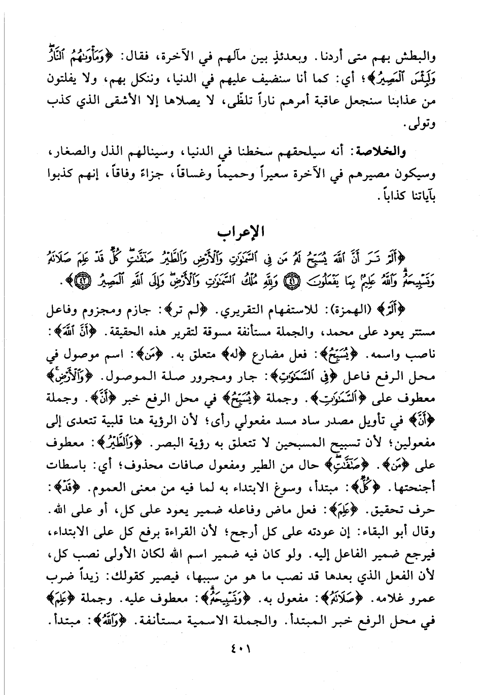 {أَلَمْ} (الهمزة): للاستفهام التقريري. {لَمْ تَرَ}: جازم ومجزوم وفاعل مستتر يعود على محمد، والجملة مستأنفة مسوقة لتقرير هذه الحقيقة. {أَنَّ اللَّهَ}: ناصب واسمه. {يُسَبِّحُ}: فعل مضارع {لَهُ} متعلق به. {مَنْ}: اسم موصول في محل الرفع فاعل {فِي السَّمَاوَاتِ}: جار ومجرور صلة الموصول. {وَالْأَرْضِ} معطوف على {السَّمَاوَاتِ}. وجملة {يُسَبِّحُ} في محل الرفع خبر {أَنَّ}. وجملة {أَنَّ} في تأويل مصدر ساد مسد مفعولي رأى؛ لأن الرؤية هنا قلبية تتعدى إلى مفعولين؛ لأن تسبيع المسبحين لا تتعلق به رؤية البصر. {وَالطَّيْرُ}: معطوف على {مَنْ}. {صَافَّاتٍ} حال من الطير ومفعول صافات محذوف؛ أي: باسطات أجنحتها. {كُلٌّ}: مبتدأ، وسوغ الابتداء به لما فيه من معنى العموم. {قَدْ}: حرف تحقيق. {عَلِمَ}: فعل ماض وفاعله ضمير يعود على كل، أو على الله. وقال أبو البقاء: إن عودته على كل أرجح؛ لأن القراءة برفع كل على الابتداء، فيرجع ضمير الفاعل إليه. ولو كان فيه ضمير اسم الله لكان الأولى نصب كل، لأن الفعل الذي بعدها قد نصب ما هو من سبببها، فيصير كقولك: زيدًا ضرب عمرو غلامه. {صَلَاتَهُ}: مفعول به. {وَتَسْبِيحَهُ}: معطوف عليه. وجملة {عَلِمَ} في محل الرفع خبر المبتدأ. والجملة الاسمية مستأنفة. {وَاللَّهُ}: مبتدأ.