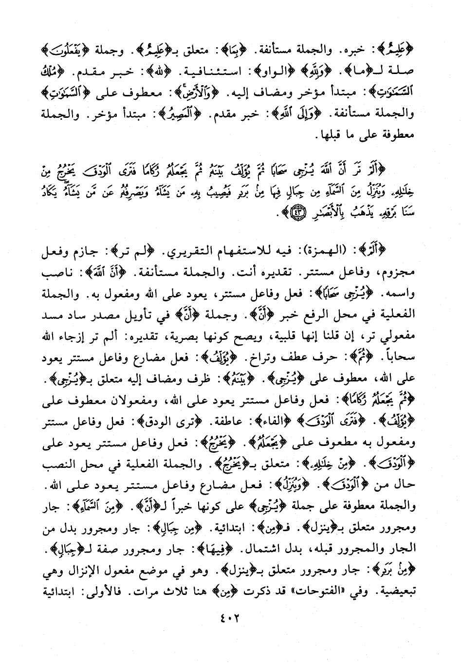 {أَلَمْ}: (الهمزة): فيه للاستفهام التقريري. {لم تر}: جازم وفعل مجزوم، وفاعل مستتر. تقديره أنت. والجملة مستأنفة. {أَنَّ اللَّهَ}: ناصب واسمه. {يُزْجِي سَحَابًا}: فعل وفاعل مستتر، يعود على الله ومفعول به. والجملة الفعلية في محل الرفع خبر {أَنَّ}. وجملة {أَنَّ} في تأويل مصدر ساد مسد مفعولي تر، إن قلنا إنها قلبية، ويصح كونها بصرية، تقديره: ألم تر إزجاء الله سحابًا. {ثُمَّ}: حرف عطف وتراخ. {يُؤَلِّفُ}: فعل مضارع وفاعل مستتر يعود على الله، معطوف على {يُزْجِي}. {بَيْنَهُ}: ظرف ومضاف إليه متعلق بـ {يُزْجِي}. {ثُمَّ يَجْعَلُهُ رُكَامًا}: فعل وفاعل مستتر يعود على الله، ومفعولان معطوف على {يُؤَلِّفُ}. {فَتَرَى الْوَدْقَ} {الفاء}: عاطفة. {ترى الودق}: فعل وفاعل مستتر ومفعول به مطعوف على {يَجْعَلُهُ}. {يَخْرُجُ}: فعل وفاعل مستتر يعود على {الْوَدْقَ}. {مِنْ خِلَالِهِ}: متعلق بـ {يَخْرُجُ}. والجملة الفعلية في محل النصب حال من {الْوَدْقَ}. {وَيُنَزِّلُ}: فعل مضارع وفاعل مستتر يعود على الله. والجملة معطوفة على جملة {يُزْجِي} على كونها خبرًا لـ {أَنَّ}. {مِنَ السَّمَاءِ}: جار ومجرور متعلق بـ {ينزل}. فـ {مِنْ}: ابتدائية. {مِنْ جِبَال}: جار ومجرور بدل من الجار والمجرور قبله، بدل اشتمال. {فِيهَا}: جار ومجرور صفة لـ {جِبَال}. {مِنْ بَرَدٍ}: جار ومجرور متعلق بـ {ينزل}. وهو في موضع مفعول الإنزال وهي تبعيضية. وفي "الفتوحات" قد ذكرت {مَنْ} هنا ثلاث مرات. فالأولى: ابتدائية