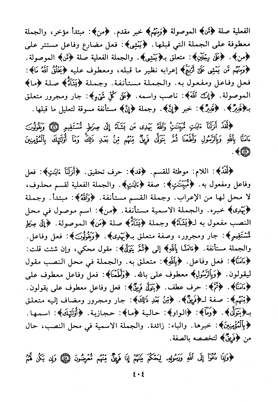 {لَقَدْ}: اللام: موطئة للقسم. {قد}: حرف تحقيق. {أَنْزَلْنَا آيَاتٍ}: فعل وفاعل ومفعول به. {مُبَيِّنَاتٍ}: صفة {آيَاتٍ}. والجملة الفعلية لقسم محذوف، لا محل لها من الإعراب. وجملة القسم مستأنفة. {وَاللَّهُ}: مبتدأ. وجملة {يَهْدِي} خبره. والجملة الاسمية مستأنفة. {من}: اسم موصول في محل النصب مفعول به لـ {يَشَاءُ} وجملة {يَشَاءُ} صلة {مَنْ} الموصولة. {إِلَى صِرَاطٍ مُسْتَقِيمٍ}: جار ومجرور، وصفة متعلق بـ {يَهْدِي}. {وَيَقُولُونَ}: فعل وفاعل. والجملة مستأنفة. {آمَنَّا بِاللَّهِ} إلى {ثُمَّ يَتَوَلَّى}: مقول محكي، وإن شئت قلت: {آمَنَّا}: فعل وفاعل. {بِاللَّهِ}: متعلق به. والجملة في محل النصب مقول ليقولون. {وَبِالرَّسُولِ} معطوف على بالله. {وَأَطَعْنَا}: فعل وفاعل معطوف على {آمَنَّا}. {ثُمَّ}: حرف عطف. {يَتَوَلَّى فَرِيقٌ}: فعل وفاعل معطوف على يقولون. {مِنْهُمْ}: صفة لـ {فَرِيقٌ}. {مِنْ بَعْدِ ذَلِكَ}: جار ومجرور ومضاف إليه متعلق بـ {يَتَوَلَّى}. {وَمَا}: {الواو}: حالية {ما}: حجازية. {أُولَئِكَ}: اسمها. {بِالْمُؤْمِنِين}: خبرها. والباء: زائدة. والجملة الاسمية في محل النصب، حال من {فَرِيقٌ} لتخصصه بالصفة.