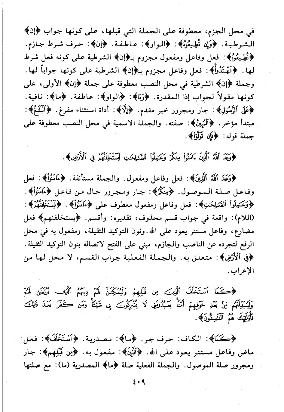 {وَعَدَ اللَّهُ الَّذِينَ} فعل وفاعل ومفعول. والجملة مستأنفة. {آمَنُوا} فعل وفاعل صلة الموصول. {مِنْكُمْ} جار ومجرور حال من فاعل {آمَنُوا}. {وَعَمِلُوا الصَّالِحَاتِ} فعل وفاعل ومفعول معطوف على {آمَنُوا}. {لَيَسْتَخْلِفَنَّهُمْ} (اللام): واقعة في جواب قسم محذوف، تقديره: وأقسم. {يستخلفنهم} فعل مضارع، وفاعل مستتر يعود على الله. ونون التوكيد الثقيلة، ومفعول به في محل الرفع لتجرده عن الناصب والجازم، مبني على الفتح لاتصاله بنون التوكيد الثقيلة. {فِي الْأَرْضِ}: متعلق به. والجملة الفعلية جواب القسم، لا محل لها من الإعراب.