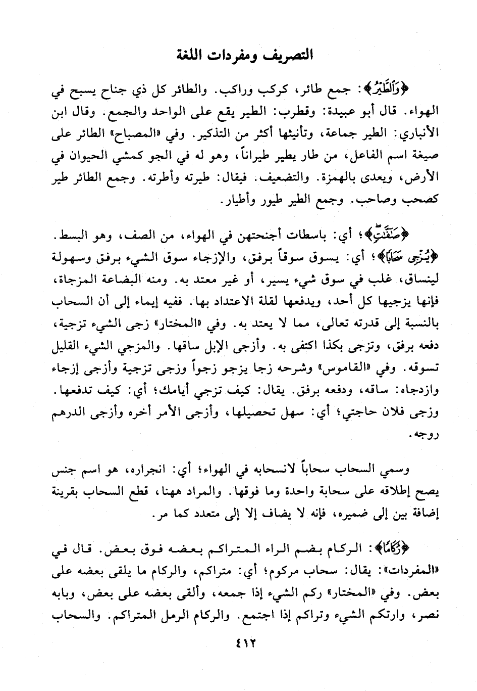 {صَافَّاتٍ} أي: باسطات أجنحتهن أى الهواء، من الصف، وهو البسط. {يُزْجِي سَحَابًا} أي: يسوق سوقًا برفق، والإزجاء سوق الشيء برفق وسهولة لينساق، غلب أى سوق شيء يسير، أو غير معتد به. ومنه البضاعة المزجاة، فإنها يزجيها كل أحد، ويدفعها لقلة الاعتداد بها. ففيه إيماء إلى أن السحاب بالنسبة إلى قدرته تعالى، ما لا يعتد به. وفي "المختار" زجى الشيء تزجية، دفعه برفق، وتزجى بكذا اكتفى به. وأزجى الإبل ساقها. والمزجي الشيء القليل تسوقه. وفي "القاموس" وشرحه زجا يزجو زجوًا وزجى تزجية وأزجى إزجاء وازدجاه: ساقه، ودفعه برفق. يقال: كيف تزجي أيامك؛ أي: كيف تدفعها. وزجى فلان حاجتي؛ أي: سهل تحصيلها، وأزجى الأمر أخره وأزجى الدرهم روجه.