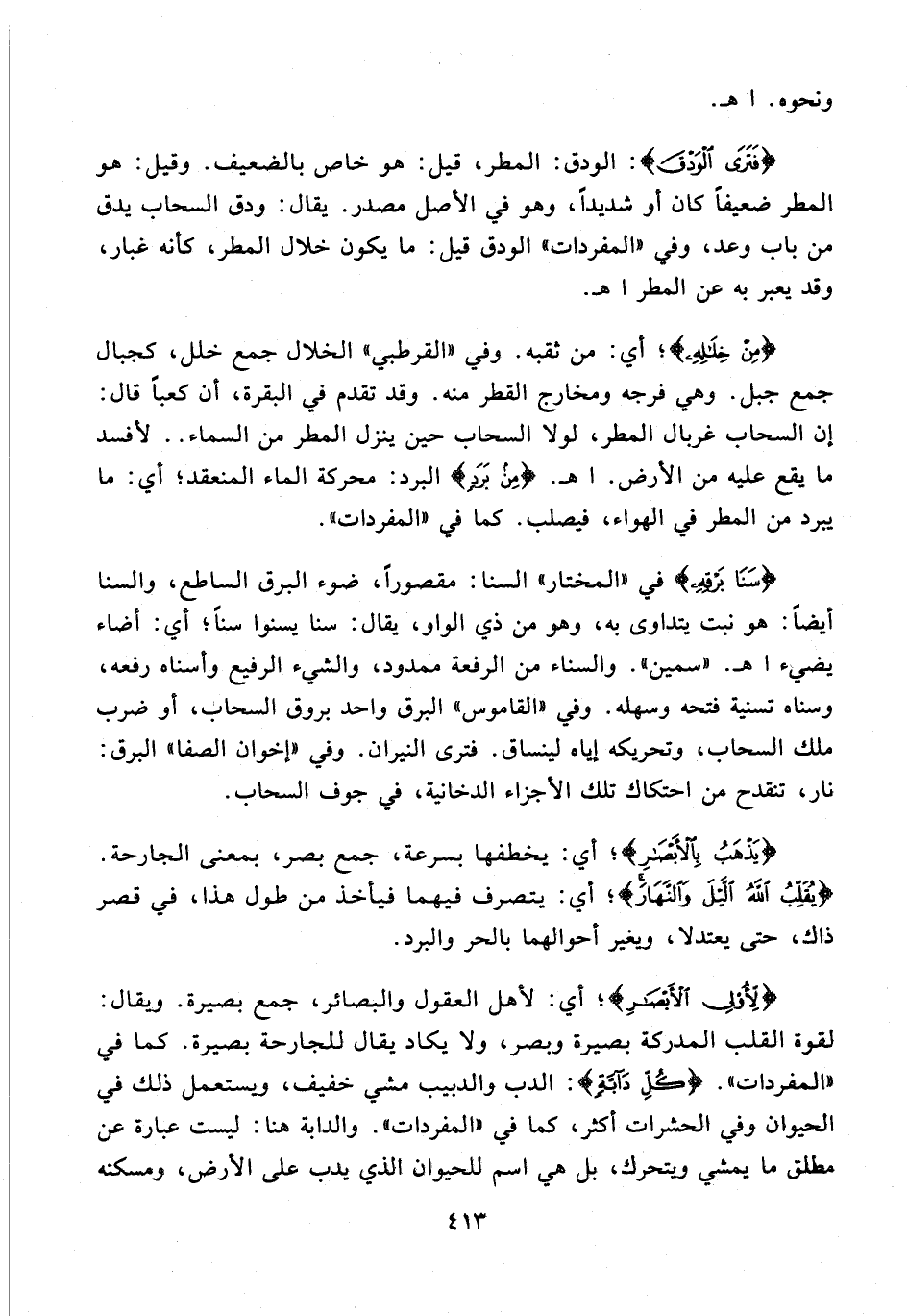 {فَتَرَى الْوَدْقَ}: الودق: المطر، قيل: هو خاص بالضعيف. وقيل: هو المطر ضعيفًا كان أو شديدًا، وهو في الأصل مصدر. يقال: ودق السحاب يدق من باب وعد، وفي "المفردات" الودق قيل: ما يكون خلال المطر، كأنه غبار، وقد يعبر به عن المطر اهـ.