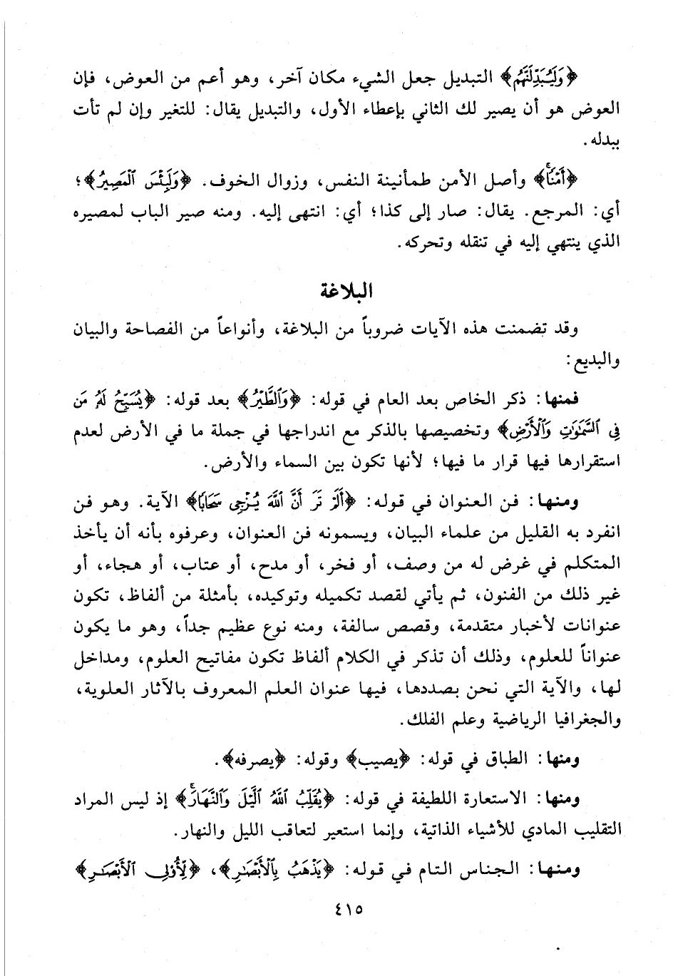 ومنها: فن العنوان في قوله: {أَلَمْ تَرَ أَنَّ اللَّهَ يُزْجِي سَحَابًا} الآية. وهو فن انفرد به القليل من علماء البيان، ويسمونه فن العنوان، وعرفوه بأنه أن يأخذ المتكلم في غرض له من وصف، أو فخر، أو مدح، أو عتاب، أو هجاء، أو غير ذلك من الفنون، ثم يأتي لقصد تكميله وتوكيده، بأمثلة من ألفاظ، تكون عنوانات لأخبار متقدمة، وقصص سالفة، ومنه نوع عظيم جدًّا، وهو ما يكون عنوانًا للعلوم، وذلك أن تذكر في الكلام ألفاظ تكون مفاتيح العلوم، ومداخل لها، والآية التي نحن بصددها، فيها عنوان العلم المعروف بالآثار العلوية، والجغرافيا الرياضية وعلم الفلك.