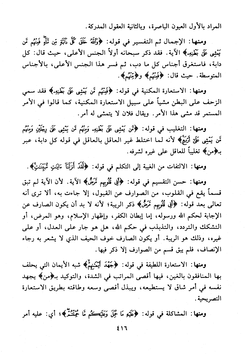 ومنها: الاستعارة المكنية في قوله: {فَمِنْهُمْ مَنْ يَمْشِي عَلَى بَطْنِهِ} فقد سمي الزحف على البطن مشيًا على سبيل الاستعارة المكنية، كما قالوا في الأمر المستمر قد مشى هذا الأمر. ويقال فلان لا يتمشى له أمر.