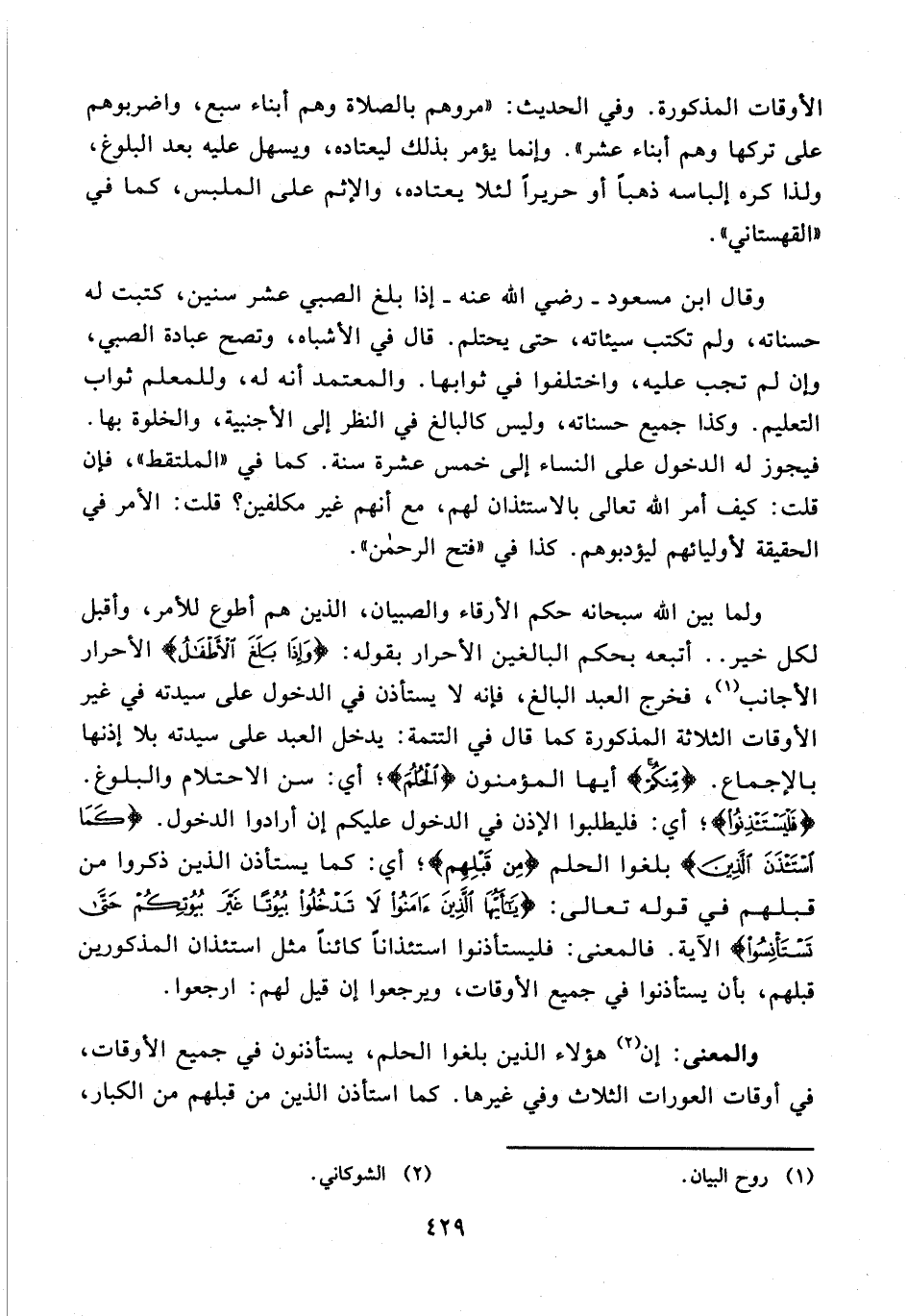 وقال ابن مسعود - رضي الله عنه - إذا بلغ الصبي عشر سنين، كتبت له حسناته، ولم تكتب سيئاته، حتى يحتلم. قال في الأشباه، وتصح عبادة الصبي، وإن لم تجب عليه، واختلفوا في ثوابها. والمعتمد أنه له، وللمعلم ثواب التعليم. وكذا جميع حسناته، وليس كالبالغ في النظر إلى الأجنبية، والخلوة بها. فيجوز له الدخول على النساء إلى خمس عشرة سنة. كما في "الملتقط"، فإن قلت: كيف أمر الله تعالى بالاستئذان لهم، مع أنهم غير مكلفين؟ قلت: الأمر في الحقيقة لأوليائهم ليؤدبوهم. كذا في "فتح الرحمن".