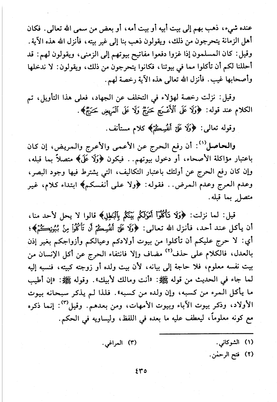 والحاصل (¬1): أن رفع الحرج عن الأعمى والأعرج والمريض، إن كان باعتبار مؤاكلة الأصحاء، أو دخول بيوتهم .. فيكون {وَلَا عَلَى} متصلًا بما قبله، وإن كان رفع الحرج عن أولئك باعتبار التكاليف، التي يشترط فيها وجود البصر،
