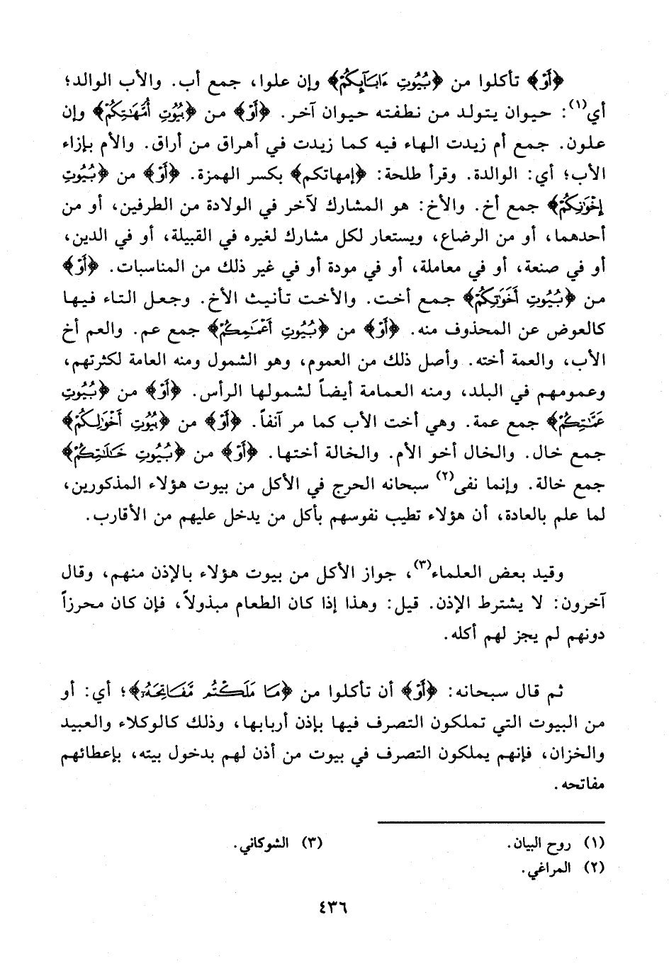 {أَوْ} تأكلوا من {بُيُوتِ آبَائِكُمْ} وإن علوا، جمع أب. والأب الوالد؛ أي (¬1): حيوان يتولد من نطفته حيوان آخر. {أَوْ} من {بُيُوتِ أُمَّهَاتِكُمْ} وإن علون. جمع أم زيدت الهاء فيه كما زيدت في أهراق من أراق. والأم بإزاء الأب؛ أي: الوالدة. وقرأ طلحة: {إمهاتكم} بكسر الهمزة. {أَوْ} من {بُيُوتِ إِخْوَانِكُمْ} جمع أخ. والأخ: هو المشارك لآخر في الولادة من الطرفين، أو من أحدهما، أو من الرضاع، ويستعار لكل مشارك لغيره في القبيلة، أو في الدين، أو في صنعة، أو في معاملة، أو في مودة أو في غير ذلك من المناسبات. {أَوْ} من {بُيُوتِ أَخَوَاتِكُمْ} جمع أخت. والأخت تأنيث الأخ. وجعل التاء فيها كالعوض عن المحذوف منه. {أَوْ} من {بُيُوتِ أَعْمَامِكُمْ} جمع عم. والعم أخ الأب، والعمة أخته. وأصل ذلك من العموم، وهو الشمول ومنه العامة لكثرتهم، وعمومهم في البلد، ومنه العمامة أيضًا لشمولها الرأس. {أَوْ} من {بُيُوتِ عَمَّاتِكُمْ} مع عمة. وهي أخت الأب كما مر آنفًا. {أَوْ} من {بُيُوتِ أَخْوَالِكُمْ} جمع خال. والخال أخو الأم. والخالة أختها. {أَوْ} من {بُيُوتِ خَالَاتِكُمْ} جمع خالة. وإنما نفى (¬2) سبحانه الحرج في الأكل من بيوت هؤلاء المذكورين، لما علم بالعادة، أن هؤلاء تطيب نفوسهم بأكل من يدخل عليهم من الأقارب.