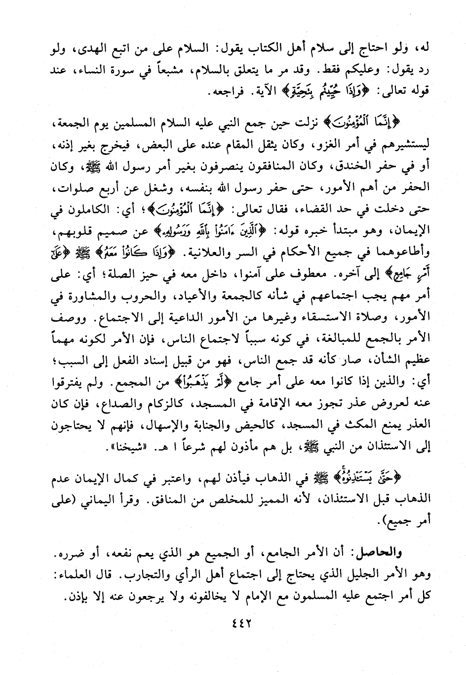 62 - {إِنَّمَا الْمُؤْمِنُونَ} نزلت حين جمع النبي عليه السلام المسلمين يوم الجمعة، ليستشيرهم في أمر الغزو، وكان يثقل المقام عنده على البعض، فيخرج بغير إذنه، أو في حفر الخندق، وكان المنافقون ينصرفون بغير أمر رسول الله - صلى الله عليه وسلم -، وكان الحفر من أهم الأمور، حتى حفر رسول الله بنفسه، وشغل عن أربع صلوات، حتى دخلت في حد القضاء، فقال تعالى: {إِنَّمَا الْمُؤْمِنُونَ} أي: الكاملون في الإيمان وهو مبتدأ خبره قوله: {الَّذِينَ آمَنُوا بِاللَّهِ وَرَسُولِهِ} عن صميم قلوبهم، وأطاعوهما في جميع الأحكام في السر والعلانية. {وَإِذَا كَانُوا مَعَهُ} - صلى الله عليه وسلم - {عَلَى أَمْرٍ جَامِعٍ} إلى آخره. معطوف على آمنوا، داخل معه في حيز الصلة؛ أي: على أمر مهم يجب اجتماعهم في شأنه كالجمعة والأعياد، والحروب والمشاورة في الأمور، وصلاة الاستسقاء وغيرها من الأمور الداعية إلى الاجتماع. ووصف الأمر بالجمع للمبالغة، في كونه سببًا لاجتماع الناس، فإن الأمر لكونه مهمًا عظيم الشأن، صار كأنه قد جمع الناس، فهو من قبيل إسناد الفعل إلى السبب؛ أي: والذين إذا كانوا معه على أمر جامع {لَمْ يَذْهَبُوا} من المجمع. ولم يفترقوا عنه لعروض عذر تجوز معه الإقامة في المسجد، كالزكام والصداع، فإن كان العذر يمنع المكث في المسجد، كالحيض والجنابة والإسهال، فإنهم لا يحتاجون إلى الاستئذان من النبي - صلى الله عليه وسلم -، بل هم مأذون لهم شرعًا اهـ. "شيخنا".