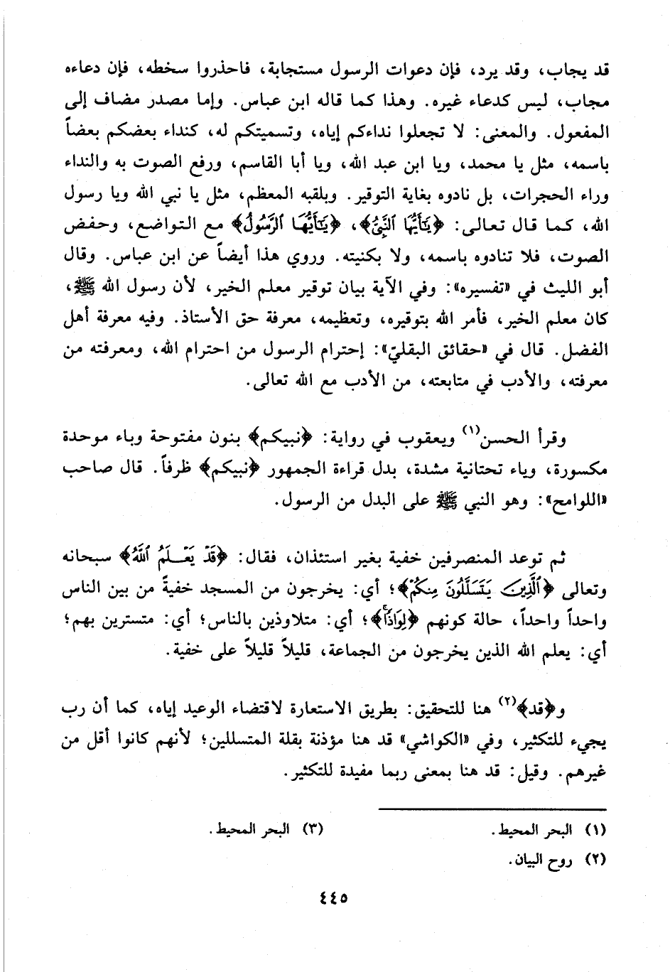 قد يجاب، وقد يرد، فإن دعوات الرسول مستجابة، فاحذروا سخطه، فإن دعاءه مجاب، ليس كدعاء غيره. وهذا كما قاله ابن عباس. وإما مصدر مضاف إلى المفعول. والمعنى: لا تجعلوا نداءكم إياه، وتسميتكم له، كنداء بعضكم بعضًا باسمه، مثل يا محمد، ويا ابن عبد الله، ويا أبا القاسم، ورفع الصوت به والنداء وراء الحجرات، بل نادوه بغاية التوقير. وبلقبه المعظم، مثل يا نبي الله ويا رسول الله، كما قال تعالى: {يَا أَيُّهَا النَّبِيُّ}، {يَا أَيُّهَا الرَّسُولُ} مع التواضع، وحفض الصوت، فلا تنادوه باسمه، ولا بكنيته. وروي هذا أيضًا عن ابن عباس. وقال أبو الليث في "تفسيره": وفي الآية بيان توقير معلم الخير؛ لأن رسول الله - صلى الله عليه وسلم -، كان معلم الخير، فأمر الله بتوقيره، وتعظيمه، معرفة حق الأستاذ. وفيه معرفة أهل الفضل. قال في "حقائق البقليّ": إحترام الرسول من احترام الله، ومعرفته من معرفته، والأدب في متابعته، من الأدب مع الله تعالى.