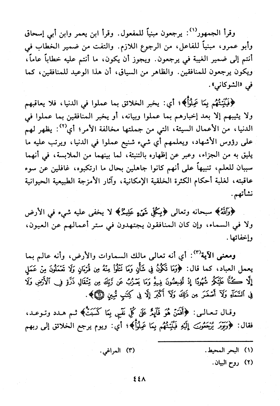 وقال تعالى: {أَفَمَنْ هُوَ قَائِمٌ عَلَى كُلِّ نَفْسٍ بِمَا كَسَبَتْ} ثم هدد وتوعد، فقال: {وَيَوْمَ يُرْجَعُونَ إِلَيْهِ فَيُنَبِّئُهُمْ بِمَا عَمِلُوا}؛ أي: ويوم يرجع الخلائق إلى ربهم