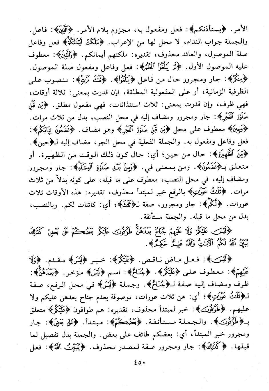 الأمر. {يستأذنكم}: فعل ومفعول به، مجزوم بلام الأمر. {الَّذِينَ}: فاعل. والجملة جواب النداء، لا محل لها من الإعراب. {مَلَكَتْ أَيْمَانُكُمْ} فعل وفاعل صلة الموصول، والعائد محذوف، تقديره: ملكتهم أيمانكم. {وَالَّذِينَ}: معطوف عليه الموصول الأول. {لَمْ يَبْلُغُوا الْحُلُمَ}: فعل وفاعل ومفعول صلة الموصول. {مِنْكُمْ}: جار ومجرور حال من فاعل {يَبْلُغُوا}. {ثَلَاثَ مَرَّاتٍ}: منصوب على الظرفية الزمانية، أو على المفعولية المطلقة، فإن قدرت بمعنى: ثلاثة أوقات، فهي ظرف، وإن قدرت بمعنى: ثلاث استئذانات، فهي مفعول مطلق. {مِنْ قَبْلِ صَلَاةِ الْفَجْرِ}: جار ومجرور ومضاف إليه في محل النصب، بدل من ثلاث مرات. {وَحِينَ} معطوف على محل {مِنْ قَبْلِ صَلَاةِ الْفَجْرِ} وهو مضاف. {تَضَعُونَ ثِيَابَكُمْ}: فعل وفاعل ومفعول به. والجملة الفعلية في محل الجر، مضاف إليه لـ {حين}. {مِنَ الظَّهِيرَةِ}: حال من حين؛ أي: حال كون ذلك الوقت من الظهيرة. أو متعلق بـ {تَضَعُونَ}. ومن بمعنى في. {وَمِنْ بَعْدِ صَلَاةِ الْعِشَاءِ}: جار ومجرور ومضاف إليه، في محل النصب، معطوف على ما قبله، على كونه بدلًا من ثلاث مرات. {ثَلَاثُ عَوْرَاتٍ} بالرفع خبر لمبتدأ محذوف، تقديره: هذه الأوقات ثلاث عورات. {لَكُمْ}: جار ومجرور، صفة لـ {ثَلَاثُ}؛ أي: كائنات لكم. وبالنصب، بدل من محل ما قبله. والجملة مستأنفة.