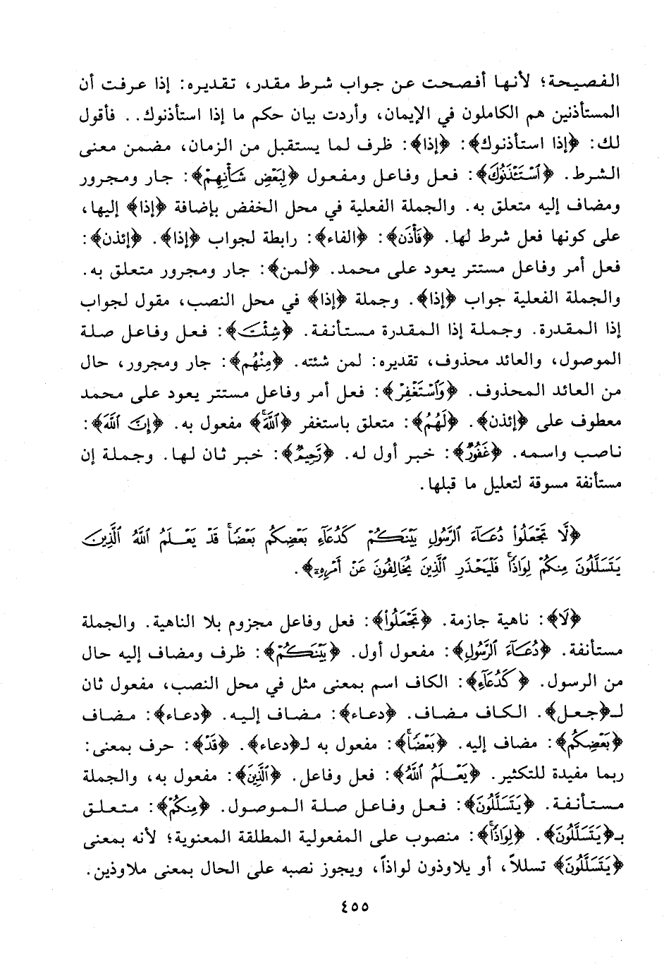{لَا}: ناهية جازمة. {تَجْعَلُوا}: فعل وفاعل مجزوم بلا الناهية. والجملة مستأنفة. {دُعَاءَ الرَّسُولِ}: مفعول أول. {بَيْنَكُمْ}: ظرف ومضاف إليه حال من الرسول. {كَدُعَاءِ}: الكاف اسم بمعنى مثل في محل النصب، مفعول ثان لـ {جعل}. الكاف مضاف. {دعاء}: مضاف إليه. {دعاء}: مضاف {بَعْضِكُمْ}: مضاف إليه. {بَعْضًا}: مفعول به لـ {دعاء}. {قَدْ}: حرف بمعنى: ربما مفيدة للتكثير. {يَعْلَمُ اللَّهُ}: فعل وفاعل. {الَّذِينَ}: مفعول به، والجملة مستأنفة. {يَتَسَلَّلُونَ}: فعل وفاعل صلة الموصول. {مِنْكُمْ}: متعلق بـ {يَتَسَلَّلُونَ}. {لِوَاذًا}: منصوب على المفعولية المطلقة المعنوية؛ لأنه بمعنى {يَتَسَلَّلُونَ} تسللًا، أو يلاوذون لواذًا، ويجوز نصبه على الحال بمعنى ملاوذين.