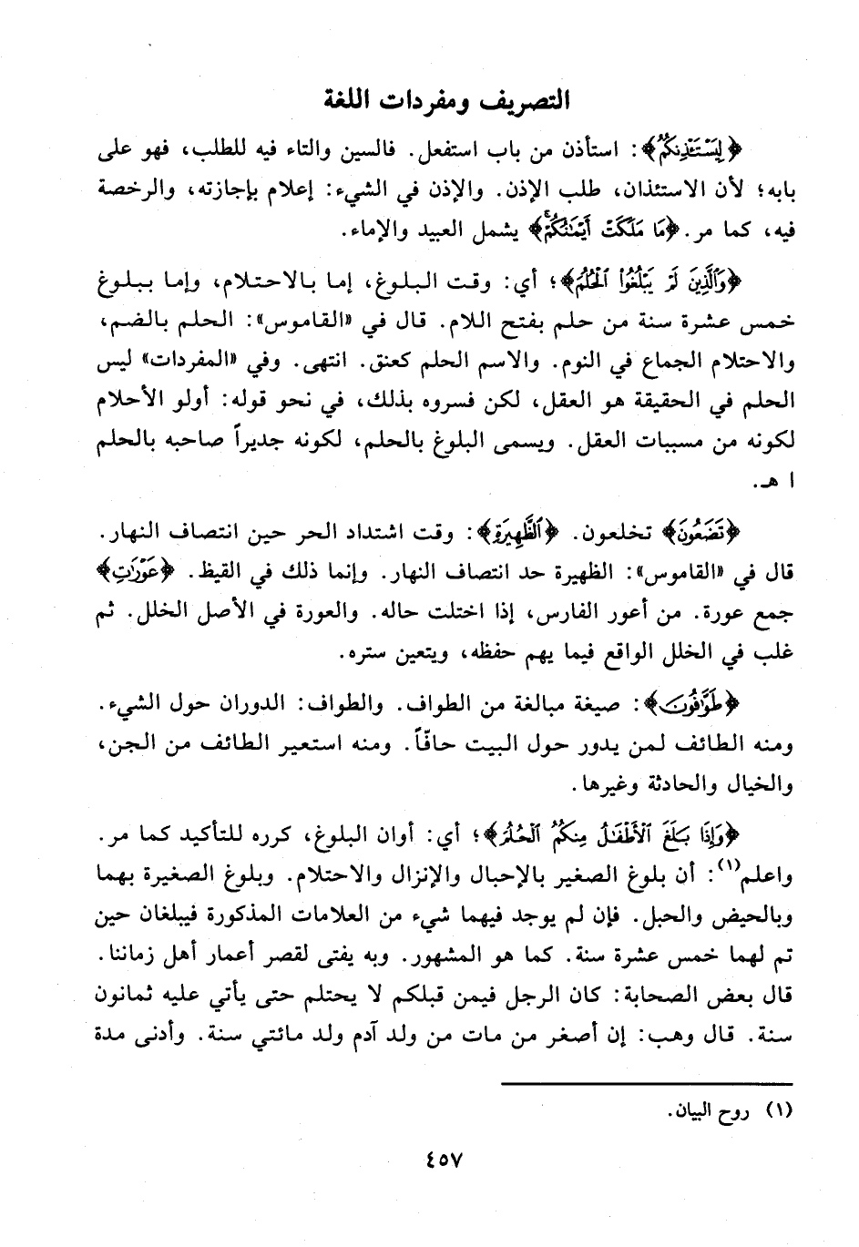 {وَإِذَا بَلَغَ الْأَطْفَالُ مِنْكُمُ الْحُلُمَ}؛ أي: أوان البلوغ، كرره للتأكيد كما مر. واعلم (¬1): أن بلوغ الصغير بالإحبال والإنزال والاحتلام. وبلوغ الصغيرة بهما وبالحيض والحبل. فإن لم يوجد فيهما شيء من العلامات المذكورة فيبلغان حين تم لهما خمس عشرة سنة. كما هو المشهور. وبه يفتى لقصر أعمار أهل زماننا. قال بعض الصحابة: كان الرجل فيمن قبلكم لا يحتلم حتى يأتي عليه ثمانون سنة. قال وهب: إن أصغر من مات من ولد آدم ولد مائتي سنة. وأدنى مدة