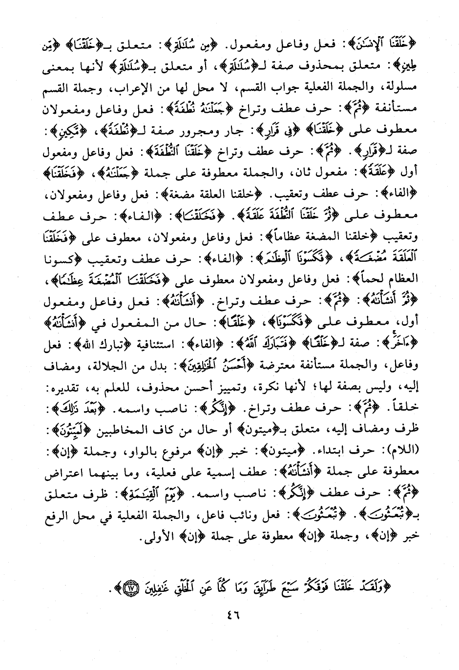 {خَلَقْنَا الْإِنْسَانَ}: فعل وفاعل ومفعول. {مِنْ سُلَالَةٍ}: متعلق بـ {خَلَقْنَا} {مِنْ طِينٍ}: متعلق بمحذوف صفة لـ {سُلَالَةٍ}، أو متعلق بـ {سُلَالَةٍ} لأنها بمعنى مسلولة، والجملة الفعلية جواب القسم، لا محل لها من الإعراب، وجملة القسم مستأنفة {ثُمَّ}: حرف عطف وتراخ {جَعَلْنَاهُ نُطْفَةً}: فعل وفاعل ومفعولان معطوف على {خَلَقْنَا} {فِي قَرَار}: جار ومجرور صفة لـ {نُطْفَةً}، {مَكِينٍ}: صفة لـ {قَرَارٍ}. {ثُمَّ}: حرف عطف وتراخ {خَلَقْنَا النُّطْفَةَ}: فعل وفاعل ومفعول أول {عَلَقَةً}: مفعول ثان، والجملة معطوفة على جملة {جَعَلْنَاهُ}، {فَخَلَقْنَا} {الفاء}: حرف عطف وتعقيب. {خلقنا العلقة مضغة}: فعل وفاعل ومفعولان، معطوف على {ثُمَّ خَلَقْنَا النُّطْفَةَ عَلَقَةً}. {فَخَلَقْنَا}: {الفاء}: حرف عطف وتعقيب {خلقنا المضغة عظامًا}: فعل وفاعل ومفعولان، معطوف على {فَخَلَقْنَا الْعَلَقَةَ مُضْغَةً}، {فَكَسَوْنَا الْعِظَامَ}: {الفاء}: حرف عطف وتعقيب {كسونا العظام لحمًا}: فعل وفاعل ومفعولان معطوف على {فَخَلَقْنَا الْمُضْغَةَ عِظَامًا}، {ثُمَّ أَنْشَأْنَاهُ}: {ثُمَّ}: حرف عطف وتراخ. {أَنْشَأْنَاهُ}: فعل وفاعل ومفعول أول، معطوف على {فَكَسَوْنَا}، {خَلْقًا}: حال من المفعول في {أَنْشَأْنَاهُ} {آخَرَ}: صفة لـ {خَلْقًا} {فَتَبَارَكَ اللَّهُ}: {الفاء}: استئنافية {تبارك الله}: فعل وفاعل، والجملة مستأنفة معترضة {أَحْسَنُ الْخَالِقِينَ}: بدل من الجلالة، ومضاف إليه، وليس بصفة لها؛ لأنها نكرة، وتمييز أحسن محذوف، للعلم به، تقديره: خلقًا. {ثُمَّ}: حرف عطف وتراخ. {إِنَّكُمْ}: ناصب واسمه. {بَعْدَ ذَلِكَ}: ظرف ومضاف إليه، متعلق بـ {ميتون} أو حال من كاف المخاطبين {لَمَيِّتُونَ}: (اللام): حرف ابتداء. {ميتون}: خبر {إن} مرفوع بالواو، وجملة {إن}: معطوفة على جملة {أَنْشَأْنَاه}: عطف إسمية على فعلية، وما بينهما اعتراض {ثُمَّ}: حرف عطف {إِنَّكُمْ}: ناصب واسمه. {يَوْمَ الْقِيَامَةِ}: ظرف متعلق بـ {تُبْعَثُونَ}. {تُبْعَثُونَ}: فعل ونائب فاعل، والجملة الفعلية في محل الرفع خبر {إن}، وجملة {إن} معطوفة على جملة {إن} الأولى.