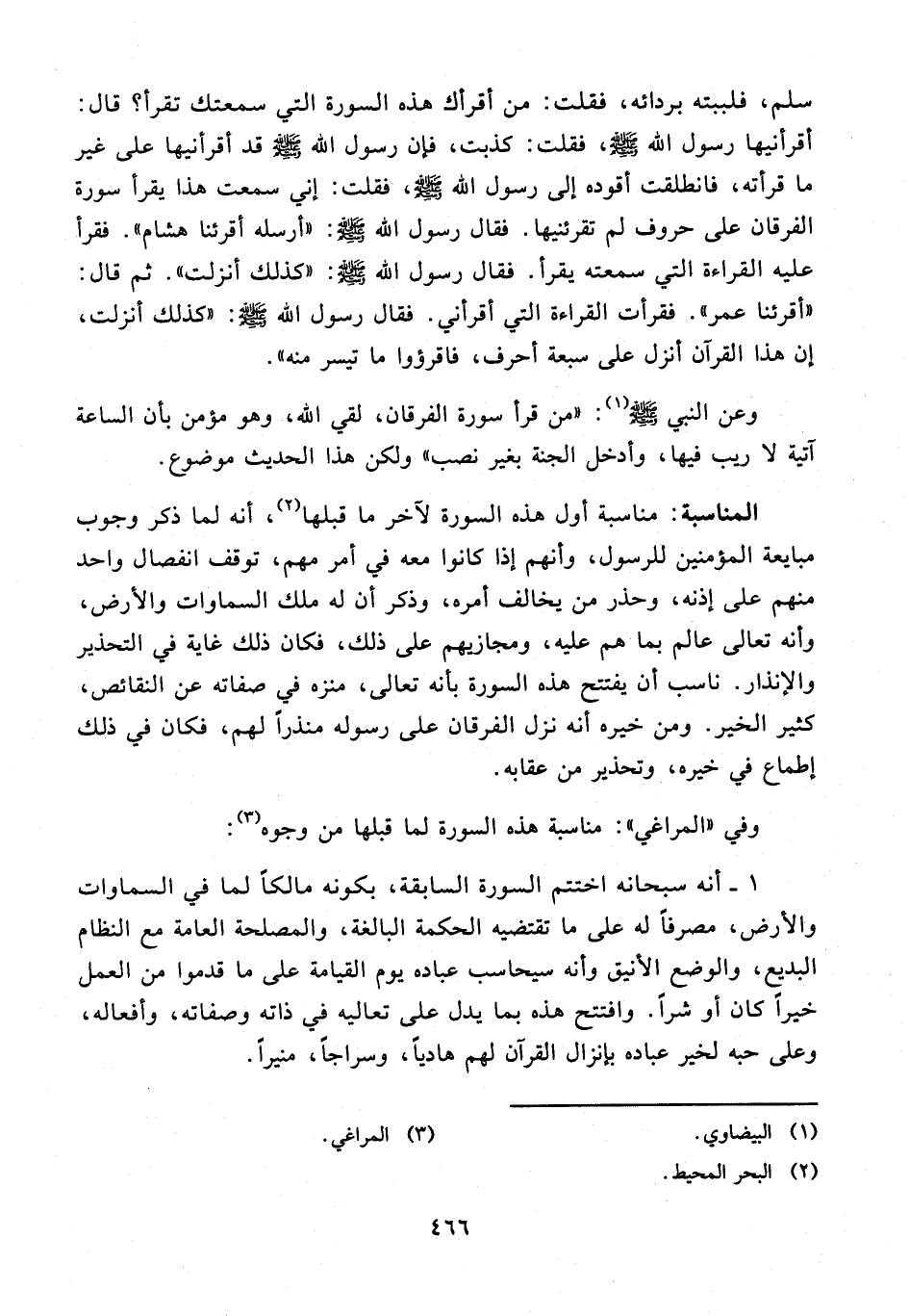 سلم، فلببته بردائه، فقلت: من أقرأك هذه السورة التي سمعتك تقرأ؟ قال: أقرأنيها رسول الله - صلى الله عليه وسلم -، فقلت: كذبت، فإن رسول الله - صلى الله عليه وسلم - قد أقرأنيها على غير ما قرأته، فانطلقت أقوده إلى رسول الله - صلى الله عليه وسلم -، فقلت: إني سمعت هذا يقرأ سورة الفرقان على حروف لم تقرئنيها. فقال رسول الله - صلى الله عليه وسلم -: "أرسله أقرئنا هشام". فقرأ عليه القراءة التي سمعته يقرأ. فقال رسول الله - صلى الله عليه وسلم -: "كذلك أنزلت". ثم قال: "أقرئنا عمر". فقرأت القراءة التي أقرأني. فقال رسول الله - صلى الله عليه وسلم -: "كذلك أنزلت، إن هذا القرآن أنزل على سبعة أحرف، فاقرؤوا ما تيسر منه".
