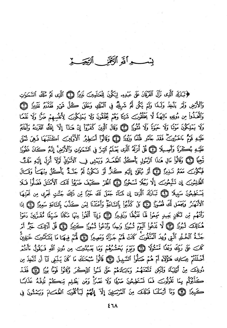 {تَبَارَكَ الَّذِي نَزَّلَ الْفُرْقَانَ عَلَى عَبْدِهِ لِيَكُونَ لِلْعَالَمِينَ نَذِيرًا (1) الَّذِي لَهُ مُلْكُ السَّمَاوَاتِ وَالْأَرْضِ وَلَمْ يَتَّخِذْ وَلَدًا وَلَمْ يَكُنْ لَهُ شَرِيكٌ فِي الْمُلْكِ وَخَلَقَ كُلَّ شَيْءٍ فَقَدَّرَهُ تَقْدِيرًا (2) وَاتَّخَذُوا مِنْ دُونِهِ آلِهَةً لَا يَخْلُقُونَ شَيْئًا وَهُمْ يُخْلَقُونَ وَلَا يَمْلِكُونَ لِأَنْفُسِهِمْ ضَرًّا وَلَا نَفْعًا وَلَا يَمْلِكُونَ مَوْتًا وَلَا حَيَاةً وَلَا نُشُورًا (3) وَقَالَ الَّذِينَ كَفَرُوا إِنْ هَذَا إِلَّا إِفْكٌ افْتَرَاهُ وَأَعَانَهُ عَلَيْهِ قَوْمٌ آخَرُونَ فَقَدْ جَاءُوا ظُلْمًا وَزُورًا (4) وَقَالُوا أَسَاطِيرُ الْأَوَّلِينَ اكْتَتَبَهَا فَهِيَ تُمْلَى عَلَيْهِ بُكْرَةً وَأَصِيلًا (5) قُلْ أَنْزَلَهُ الَّذِي يَعْلَمُ السِّرَّ فِي السَّمَاوَاتِ وَالْأَرْضِ إِنَّهُ كَانَ غَفُورًا رَحِيمًا (6) وَقَالُوا مَالِ هَذَا الرَّسُولِ يَأْكُلُ الطَّعَامَ وَيَمْشِي فِي الْأَسْوَاقِ لَوْلَا أُنْزِلَ إِلَيْهِ مَلَكٌ فَيَكُونَ مَعَهُ نَذِيرًا (7) أَوْ يُلْقَى إِلَيْهِ كَنْزٌ أَوْ تَكُونُ لَهُ جَنَّةٌ يَأْكُلُ مِنْهَا وَقَالَ الظَّالِمُونَ إِنْ تَتَّبِعُونَ إِلَّا رَجُلًا مَسْحُورًا (8) انْظُرْ كَيْفَ ضَرَبُوا لَكَ الْأَمْثَالَ فَضَلُّوا فَلَا يَسْتَطِيعُونَ سَبِيلًا (9) تَبَارَكَ الَّذِي إِنْ شَاءَ جَعَلَ لَكَ خَيْرًا مِنْ ذَلِكَ جَنَّاتٍ تَجْرِي مِنْ تَحْتِهَا الْأَنْهَارُ وَيَجْعَلْ لَكَ قُصُورًا (10) بَلْ كَذَّبُوا بِالسَّاعَةِ وَأَعْتَدْنَا لِمَنْ كَذَّبَ بِالسَّاعَةِ سَعِيرًا (11) إِذَا رَأَتْهُمْ مِنْ مَكَانٍ بَعِيدٍ سَمِعُوا لَهَا تَغَيُّظًا وَزَفِيرًا (12) وَإِذَا أُلْقُوا مِنْهَا مَكَانًا ضَيِّقًا مُقَرَّنِينَ دَعَوْا هُنَالِكَ ثُبُورًا (13) لَا تَدْعُوا الْيَوْمَ ثُبُورًا وَاحِدًا وَادْعُوا ثُبُورًا كَثِيرًا (14) قُلْ أَذَلِكَ خَيْرٌ أَمْ جَنَّةُ الْخُلْدِ الَّتِي وُعِدَ الْمُتَّقُونَ كَانَتْ لَهُمْ جَزَاءً وَمَصِيرًا (15) لَهُمْ فِيهَا مَا يَشَاءُونَ خَالِدِينَ كَانَ عَلَى رَبِّكَ وَعْدًا مَسْئُولًا (16) وَيَوْمَ يَحْشُرُهُمْ وَمَا يَعْبُدُونَ مِنْ دُونِ اللَّهِ فَيَقُولُ أَأَنْتُمْ أَضْلَلْتُمْ عِبَادِي هَؤُلَاءِ أَمْ هُمْ ضَلُّوا السَّبِيلَ (17) قَالُوا سُبْحَانَكَ مَا كَانَ يَنْبَغِي لَنَا أَنْ نَتَّخِذَ مِنْ دُونِكَ مِنْ أَوْلِيَاءَ وَلَكِنْ مَتَّعْتَهُمْ وَآبَاءَهُمْ حَتَّى نَسُوا الذِّكْرَ وَكَانُوا قَوْمًا بُورًا (18) فَقَدْ كَذَّبُوكُمْ بِمَا تَقُولُونَ فَمَا تَسْتَطِيعُونَ صَرْفًا وَلَا نَصْرًا وَمَنْ يَظْلِمْ مِنْكُمْ نُذِقْهُ عَذَابًا كَبِيرًا (19) وَمَا أَرْسَلْنَا قَبْلَكَ مِنَ الْمُرْسَلِينَ إِلَّا إِنَّهُمْ لَيَأْكُلُونَ الطَّعَامَ وَيَمْشُونَ فِي
