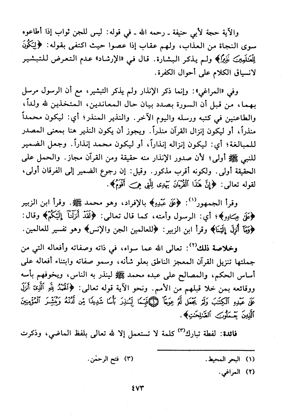 والآية حجة لأبي حنيفة - رحمه الله - في قوله: ليس للجن ثواب إذا أطاعوه سوى النجاة من العذاب، ولهم عقاب إذا عصوا حيث اكتفى بقوله: {لِيَكُونَ لِلْعَالَمِينَ نَذِيرًا} ولم يذكر البشارة. قال في "الإرشاد" عدم التعرض للتبشير لانسياق الكلام على أحوال الكفرة.