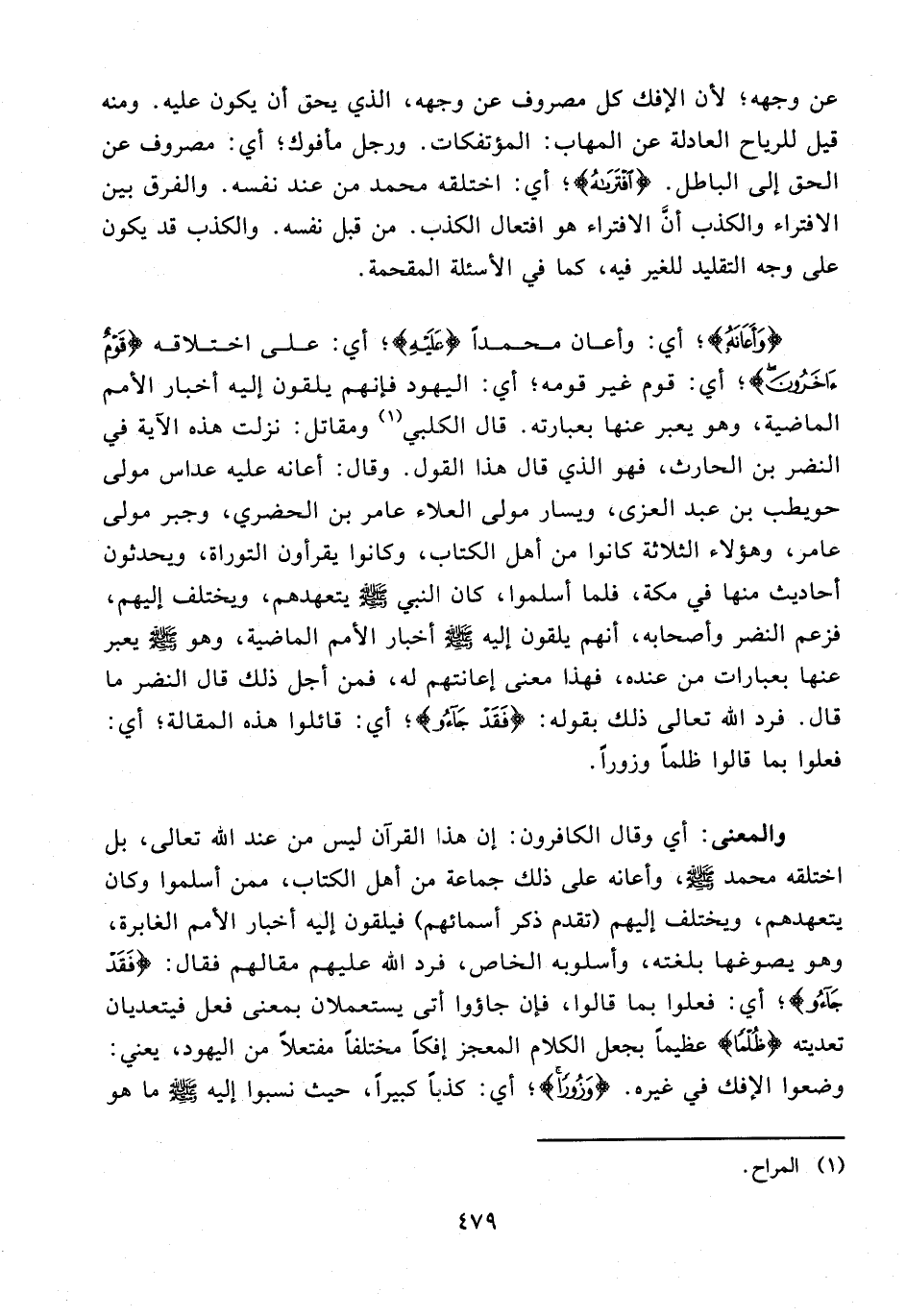 عن وجهه؛ لأن الإفك كل مصروف عن وجهه، الذي يحق أن يكون عليه. ومنه قيل للرياح العادلة عن المهاب: المؤتفكات. ورجل مأفوك؛ أي: مصروف عن الحق إلى الباطل. {افْتَرَاهُ}؛ أي: اختلقه محمد من عند نفسه. والفرق بين الافتراء والكذب أنَّ الافتراء هو افتعال الكذاب. من قبل نفسه. والكذب قد يكون على وجه التقليد للغير فيه، كما في الأسئلة المقحمة.