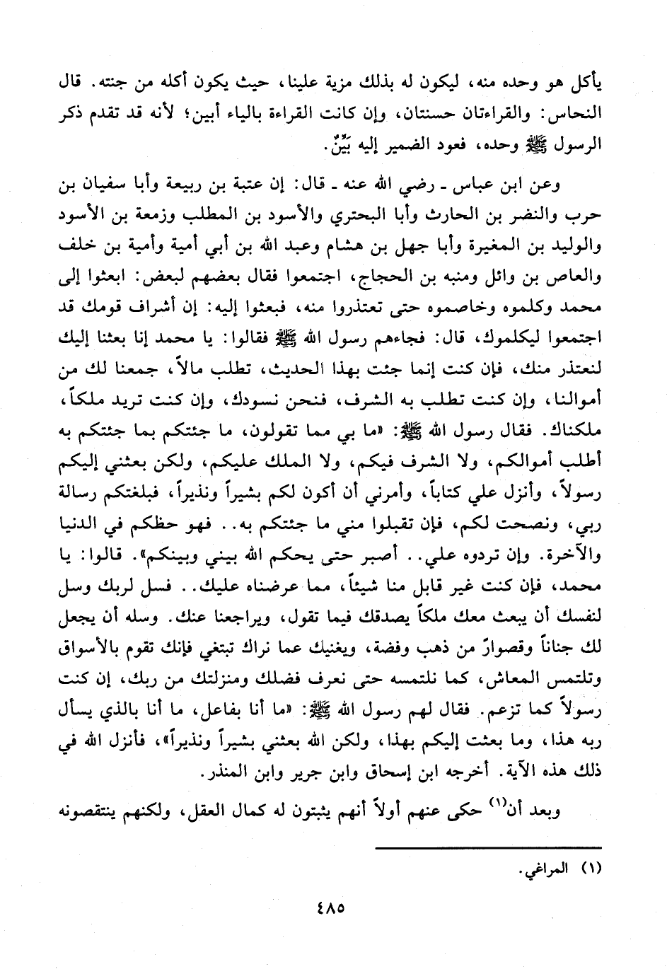وعن ابن عباس - رضي الله عنه - قال: إن عتبة بن ربيعة وأبا سفيان بن حرب والنضر بن الحارث وأبا البحتري والأسود بن المطلب وزمعة بن الأسود والوليد بن المغيرة وأبا جهل بن هشام وعبد الله بن أبي أمية وأمية بن خلف والعاص بن وائل ومنبه بن الحجاج، اجتمعوا فقال بعضهم لبعض: ابعثوا إلى محمد وكلموه وخاصموه حتى تعتذروا منه، فبعثوا إليه: إن أشراف قومك قد اجتمعوا ليكلموك، قال: فجاءهم رسول الله - صلى الله عليه وسلم - فقالوا: يا محمد إنا بعثنا إليك لنعتذر منك، فإن كنت إنما جئت بهذا الحديث، تطلب مالًا، جمعنا لك من أموالنا، وإن كنت تطلب به الشرف، فنحن نسودك، وإن كنت تريد ملكًا، ملكناك. فقال رسول الله - صلى الله عليه وسلم -: "ما بي مما تقولون، ما جئتكم بما جئتكم به أطلب أموالكم، ولا الشرف فيكم، ولا الملك عليكم، ولكن بعثني إليكم رسولًا، وأنزل علي كتابًا، وأمرني أن أكون لكم بشيرًا ونذيرًا، فبلغتكم رسالة ربي، ونصحت لكم، فإن تقبلوا مني ما جئتكم به .. فهو حظكم في الدنيا والآخرة. وإن تردوه علي .. أصبر حتى يحكم الله بيني وبينكم". قالوا: يا محمد، فإن كنت غير قابل منا شيئًا، مما عرضناه عليك .. فسل لربك وسل لنفسك أن يبعث معك ملكًا يصدقك فيما تقول، ويراجعنا عنك. وسله أن يجعل لك جنانًا وقصورًا من ذهب وفضة، ويغنيك عما نراك تبتغي فإنك تقوم بالأسواق وتلتمس المعاش، كما نلتمسه حتى نعرف فضلك ومنزلتك من ربك، إن كنت رسولًا كما تزعم. فقال لهم رسول الله - صلى الله عليه وسلم -: "ما أنا بفاعل، ما أنا بالذي يسأل ربه هذا، وما بعثت إليكم بهذا, ولكن الله بعثني بشيرًا ونذيرًا"، فأنزل الله في ذلك هذه الآية. أخرجه ابن إسحاق وابن جرير وابن المنذر.