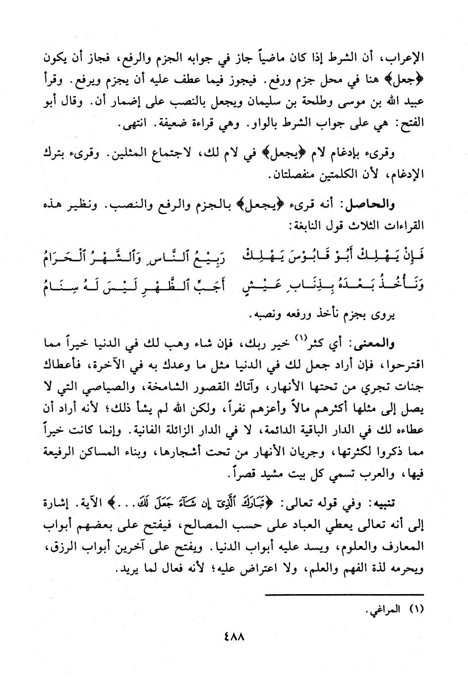 الإعراب، أن الشرط إذا كان ماضيًا جاز في جوابه الجزم والرفع، فجاز أن يكون {جعل} هنا في محل جزم ورفع. فيجوز فيما عطف عليه أن يجزم ويرفع. وقرأ عبيد الله بن موسى وطلحة بن سليمان ويجعل بالنصب على إضمار أن. وقال أبو الفتح: هي على جواب الشرط بالواو. وهي قراءة ضعيفة. انتهى.