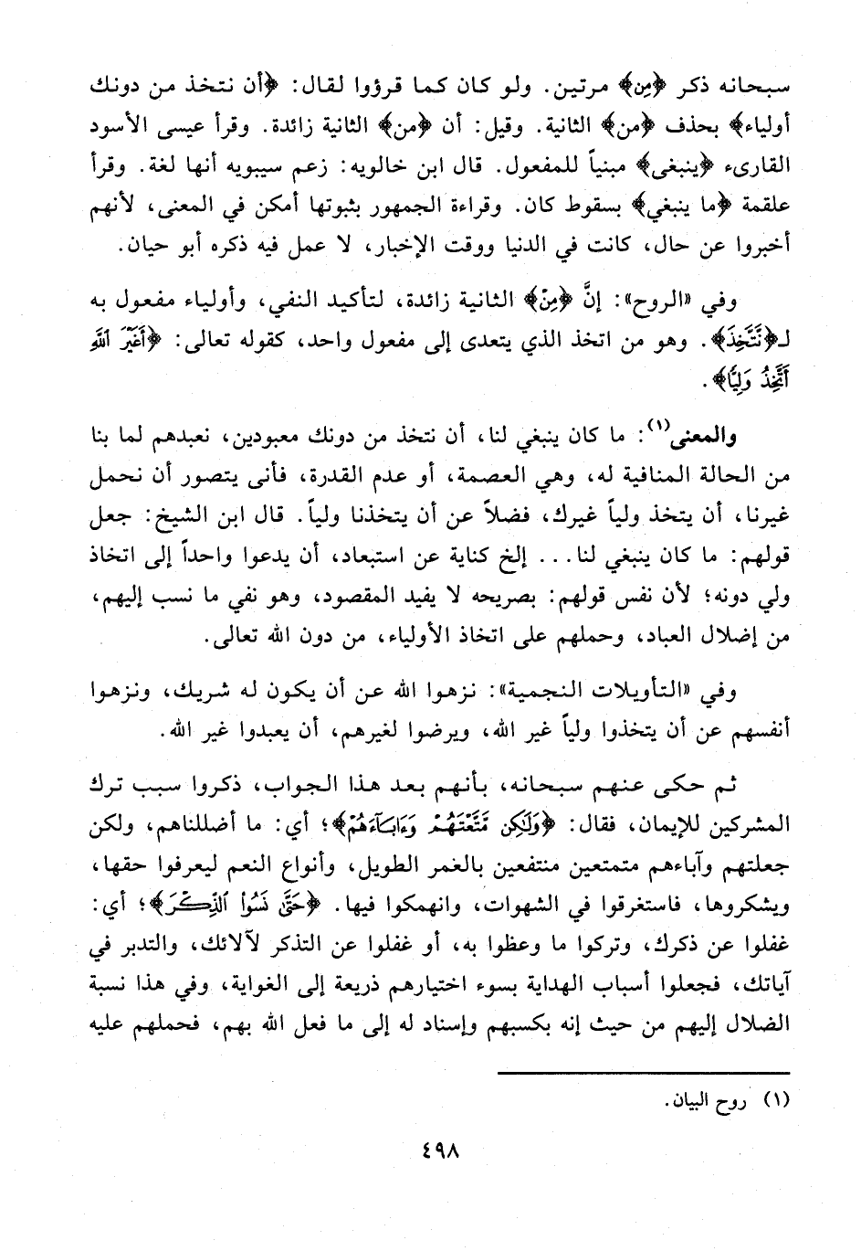سبحانه ذكر {مِن} مرتين. ولو كان كما قرؤوا لقال: {أن نتخذ من دونك أولياء} بحذف {من} الثانية. وقيل: أن {من} الثانية زائدة. وقرأ عيسى الأسود القارىء {ينبغى} مبنيًا للمفعول. قال ابن خالويه: زعم سيبويه أنها لغة. وقرأ علقمة {ما ينبغي} بسقوط كان. وقراءة الجمهور بثبوتها أمكن في المعنى, لأنهم أخبروا عن حال، كانت في الدنيا ووقت الإخبار، لا عمل فيه ذكره أبو حيان.