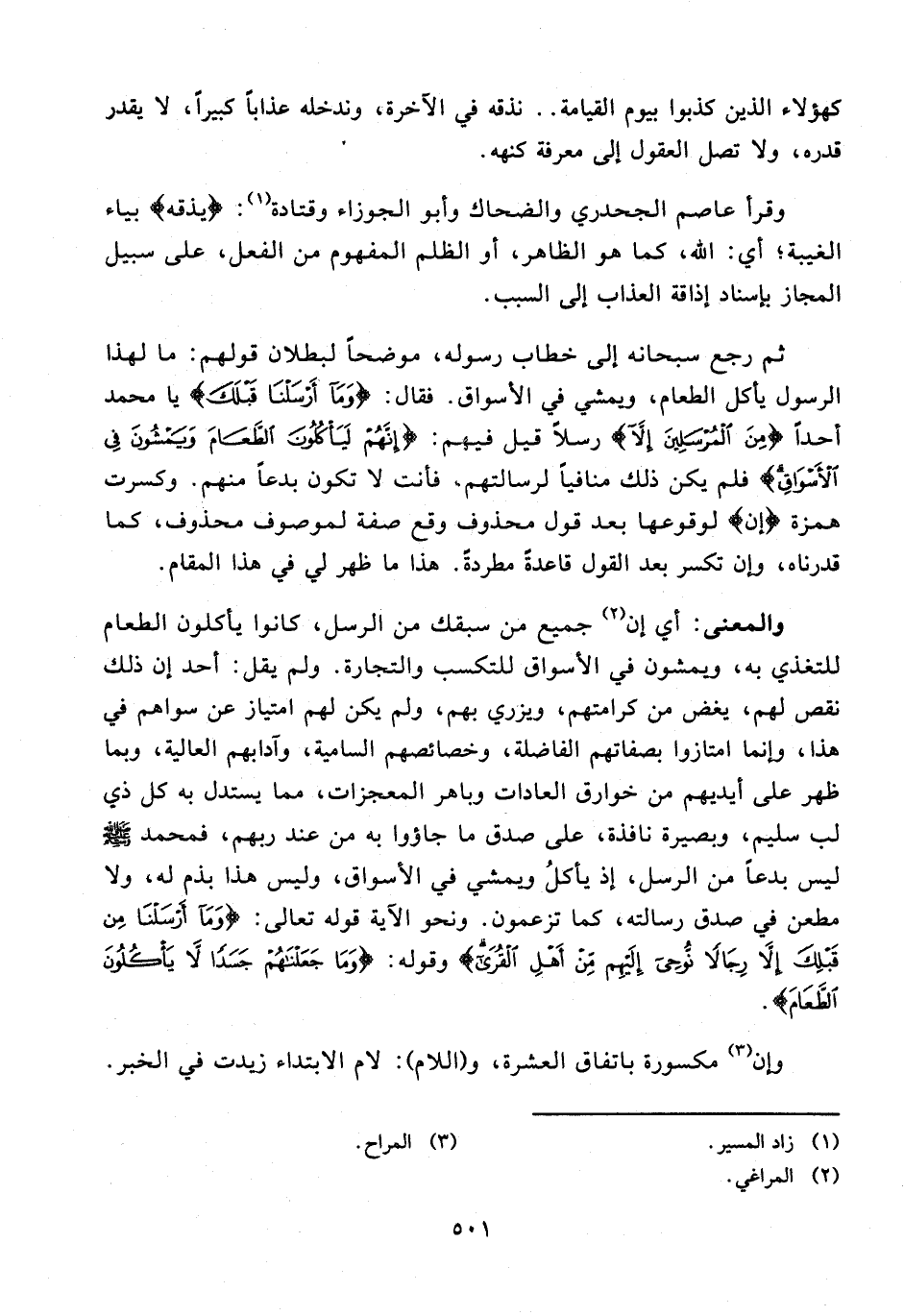 20 - ثم رجع سبحانه إلى خطاب رسوله، موضحًا لبطلان قولهم: ما لهذا الرسول يأكل الطعام، ويمشي في الأسواق. فقال: {وَمَا أَرْسَلْنَا قَبْلَكَ} يا محمد أحدًا {مِنَ الْمُرْسَلِينَ إِلَّا} رسلًا قيل فيهم: {إِنَّهُمْ لَيَأْكُلُونَ الطَّعَامَ وَيَمْشُونَ فِي الْأَسْوَاقِ} فلم يكن ذلك منافيًا لرسالتهم, فأنت لا تكون بدعًا منهم. وكسرت همزة {إن} لوقوعها بعد قول محذوف وقع صفة لموصوف محذوف، كما قدرناه، وإن تكسر بعد القول قاعدةً مطردةً. هذا ما ظهر لي في هذا المقام.