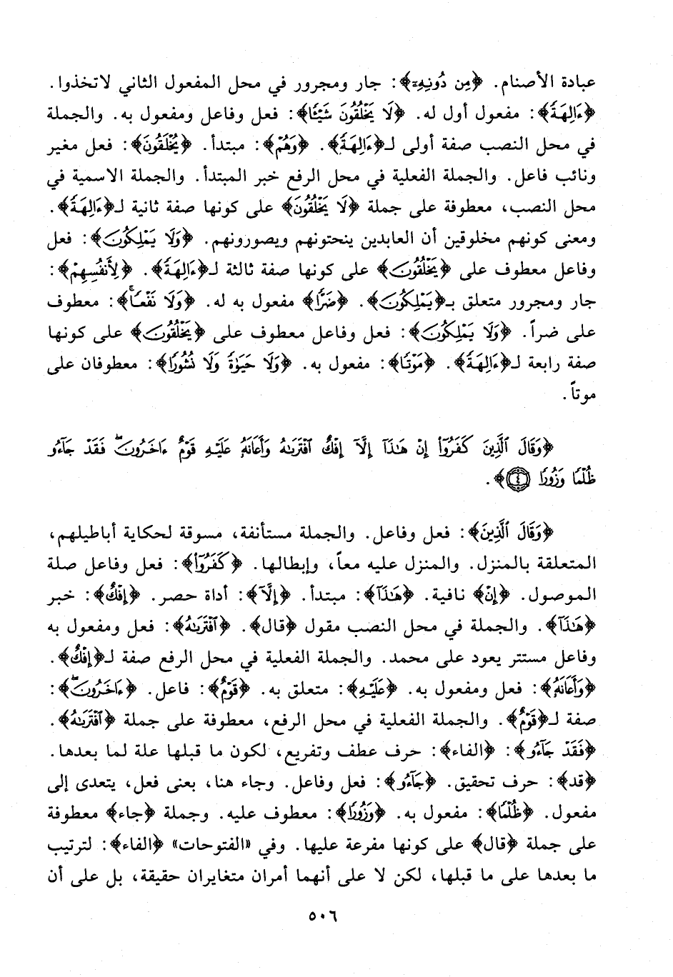 عبادة الأصنام. {مِنْ دُونِهِ}: جار ومجرور في محل المفعول الثاني لاتخذوا. {آلِهَةً}: مفعول أول له. {لَا يَخْلُقُونَ شَيْئًا}: فعل وفاعل ومفعول به. والجملة في محل النصب صفة أولى لـ {آلِهَةً}. {وَهُمْ}: مبتدأ. {يُخْلَقُونَ}: فعل مغير ونائب فاعل. والجملة الفعلية في محل الرفع خبر المبتدأ. والجملة الاسمية في محل النصب، معطوفة على جملة {لَا يَخْلُقُونَ} على كونها صفة ثانية لـ {آلِهَةً}. ومعنى كونهم مخلوقين أن العابدين ينحتونهم ويصورونهم. {وَلَا يَمْلِكُونَ}: فعل وفاعل معطوف على {يُخْلَقُونَ} على كونها صفة ثالثة لـ {آلِهَةً}. {لِأَنْفُسِهِمْ}: جار ومجرور متعلق بـ {يَمْلِكُونَ}. {ضَرًّا} مفعول به له. {وَلَا نَفْعًا}: معطوف على ضرًا. {وَلَا يَمْلِكُونَ}: فعل وفاعل معطوف على {يُخْلَقُونَ} على كونها صفة رابعة لـ {آلِهَةً}. {مَوْتًا}: مفعول به. {وَلَا حَيَاةً وَلَا نُشُورًا}: معطوفان على موتًا.