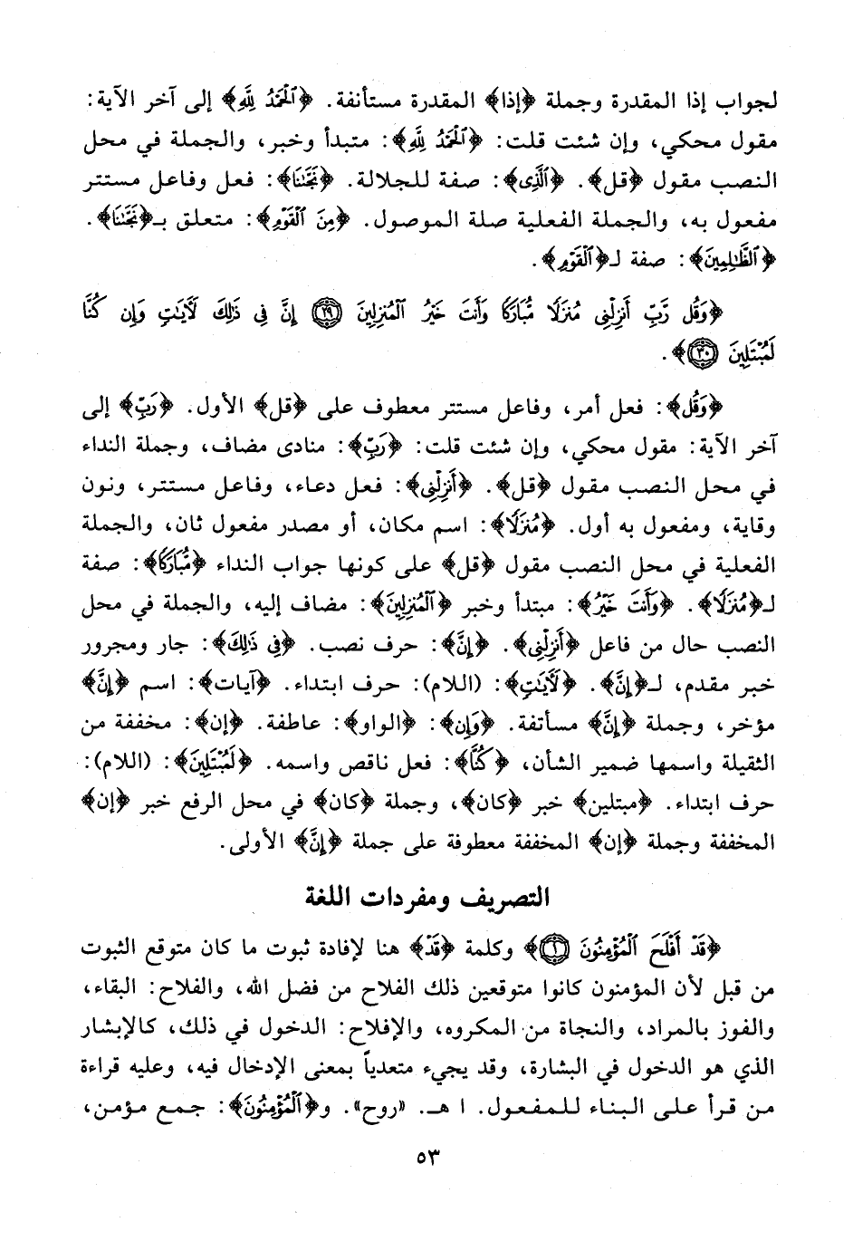 {وَقُلْ}: فعل أمر، وفاعل مستتر معطوف على {قل} الأول. {رَبِّ} إلى آخر الآية: مقول محكي، وإن شئت قلت: {رَبِّ}: منادى مضاف، وجملة النداء في محل النصب مقول {قل}. {أَنْزِلْنِي}: فعل دعاء، وفاعل مستتر، ونون وقاية، ومفعول به أول. {مُنْزَلًا}: اسم مكان، أو مصدر مفعول ثان، والجملة الفعلية في محل النصب مقول {قل} على كونها جواب النداء {مُبَارَكًا}: صفة لـ {مُنْزَلًا}. {وَأَنْتَ خَيْرُ}: مبتدأ وخبر {الْمُنْزِلِينَ}: مضاف إليه، والجملة في محل النصب حال من فاعل {أَنْزِلْنِي}. {إنَّ}: حرف نصب. {فِي ذَلِكَ}: جار ومجرور خبر مقدم، لـ {إنَّ}. {لَآيَات}: {اللام}: حرف ابتداء. {آيات}: اسم {إنَّ} مؤخر، وجملة {إنَّ} مسأتفة. {وَإِن}: {الواو}: عاطفة. {إن}: مخففة من الثقيلة واسمها ضمير الشأن، {كُنَّا}: فعل ناقص واسمه. {لَمُبْتَلِينَ}: (اللام): حرف ابتداء. {مبتلين} خبر {كان}، وجملة {كان} في محل الرفع خبر {إن} المخففة وجملة {إن} المخففة معطوفة على جملة {إنَّ} الأولى.