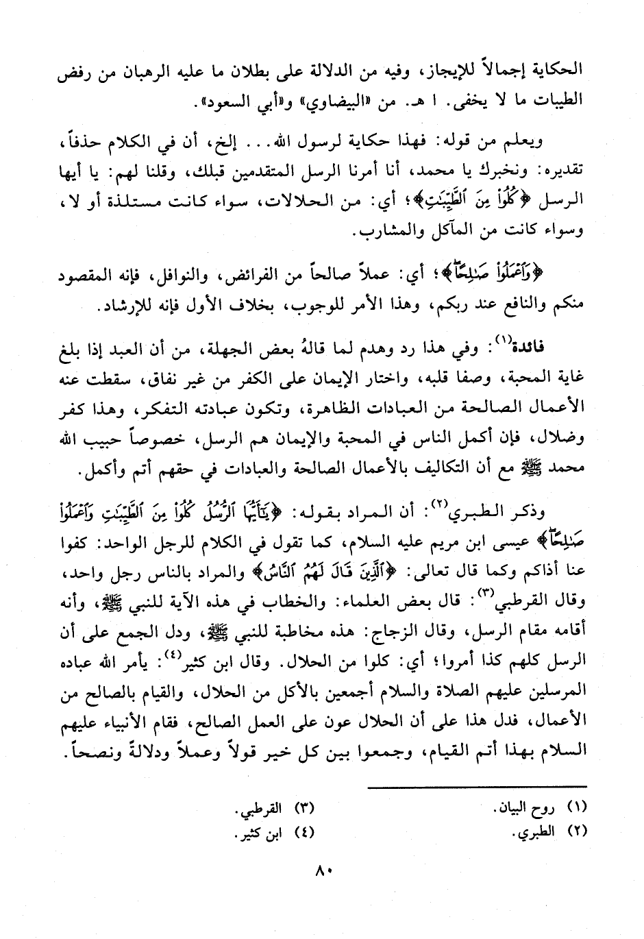 وذكر الطبري (¬2): أن المراد بقوله: {يَا أَيُّهَا الرُّسُلُ كُلُوا مِنَ الطَّيِّبَاتِ وَاعْمَلُوا صَالِحًا} عيسى ابن مريم عليه السلام، كما تقول في الكلام للرجل الواحد: كفوا عنا أذاكم وكما قال تعالى: {الَّذِينَ قَالَ لَهُمُ النَّاسُ} والمراد بالناس رجل واحد، وقال القرطبي (¬3): قال بعض العلماء: والخطاب في هذه الآية للنبي - صلى الله عليه وسلم -، وأنه أقامه مقام الرسل، وقال الزجاج: هذه مخاطبة للنبي - صلى الله عليه وسلم -، ودل الجمع على أن الرسل كلهم كذا أمروا؛ أي: كلوا من الحلال. وقال ابن كثير (¬4): يأمر الله عباده المرسلين عليهم الصلاة والسلام أجمعين بالأكل من الحلال، والقيام بالصالح من الأعمال، فدل هذا على أن الحلال عون على العمل الصالح، فقام الأنبياء عليهم السلام بهذا أتم القيام، وجمعوا بين كل خير قولًا وعملًا ودلالةً ونصحًا.