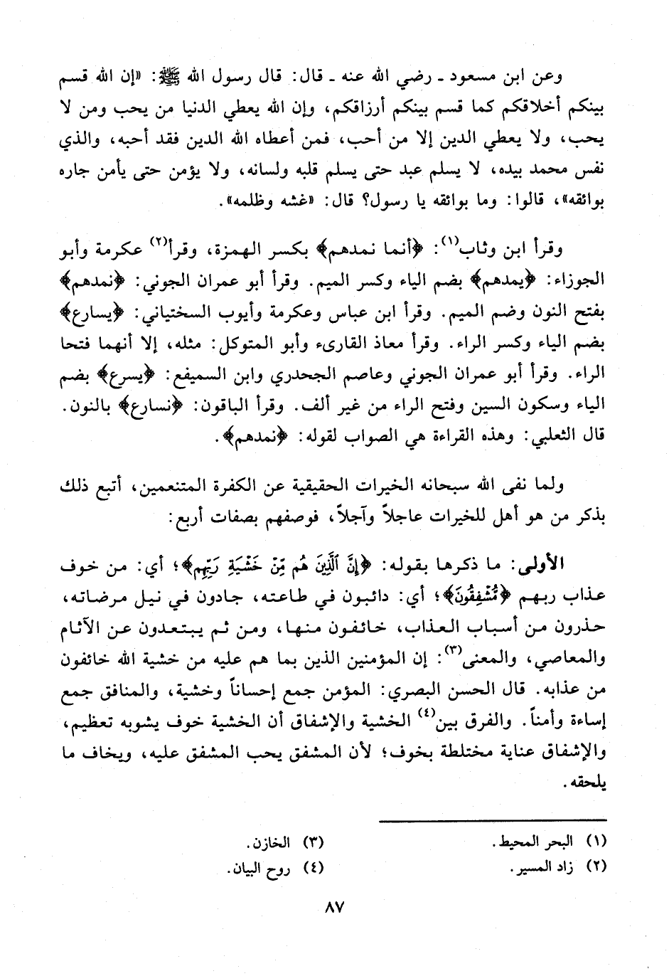 57 - ما ذكرها بقوله: {إِنَّ الَّذِينَ هُمْ مِنْ خَشْيَةِ رَبِّهِمْ}؛ أي: من خوف عذاب ربهم {مُشْفِقُونَ}؛ أي: دائبون في طاعته، جادون في نيل مرضاته، حذرون من أسباب العذاب، خائفون منها، ومن ثم يبتعدون عن الآثام والمعاصي، والمعنى (¬3): إن المؤمنين الذين بما هم عليه من خشية الله خائفون من عذابه. قال الحسن البصري: المؤمن جمع إحسانًا وخشية، والمنافق جمع إساءة وأمنًا. والفرق بين (¬4) الخشية والإشفاق أن الخشية خوف يشوبه تعظيم، والإشفاق عناية مختلطة بخوف؛ لأن المشفق يحب المشفق عليه، ويخاف ما يلحقه.