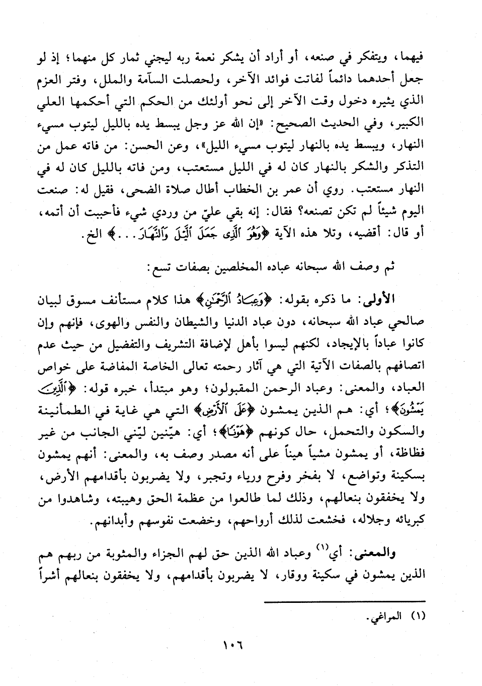 والمعنى: أي (¬1) وعباد الله الذين حق لهم الجزاء والمثوبة من ربهم هم الذين يمشون في سكينة ووقار، لا يضربون بأقدامهم، ولا يخفقون بنعالهم أشرًا