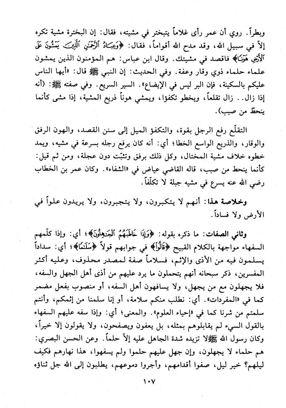 وبطرًا. روي أن عمر رأى غلامًا يتبختر في مشيته، فقال: إن البخترة مشية تكره إلَّا في سبيل الله، وقد مدح الله أقوامًا، فقال: {وَعِبَادُ الرَّحْمَنِ الَّذِينَ يَمْشُونَ عَلَى الْأَرْضِ هَوْنًا} فاقصد في مشيتك. وقال ابن عباس: هم المؤمنون الذين يمشون علماء حلماء ذوي وقار وعفة. وفي الحديث: إن النبي - صلى الله عليه وسلم - قال: "أيها الناس عليكم بالسكينة، فإن البر ليس في الإيضاع". السير السريع. وفي صفته - صلى الله عليه وسلم -: (أنه إذا زال .. زال تقلعًا، ويخطو تكفؤا، ويمشي هونًا ذريع المشية، إذا مشى كأنما ينحطّ من صبب).