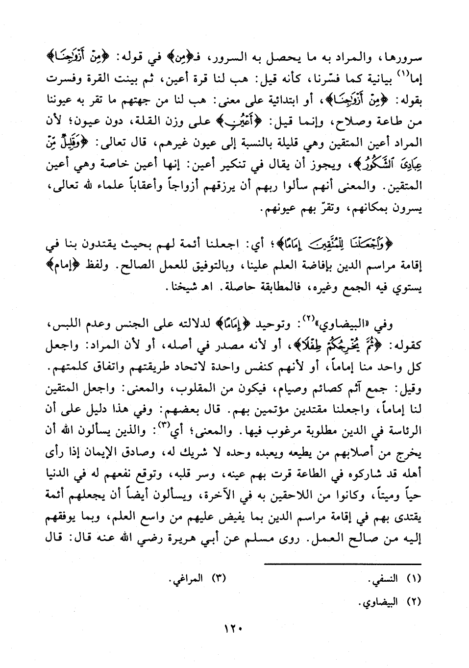 وفي "البيضاوي" (¬2): وتوحيد {إِمَامًا} لدلالته على الجنس وعدم اللبس، كقوله: {ثُمَّ يُخْرِجُكُمْ طِفْلًا}، أو لأنه مصدر في أصله، أو لأن المراد: واجعل كل واحد منا إمامًا، أو لأنهم كنفس واحدة لاتحاد طريقتهم واتفاق كلمتهم. وقيل: جمع آثم كصائم وصيام، فيكون من المقلوب، والمعنى: واجعل المتقين لنا إمامًا، واجعلنا مقتدين مؤتمين بهم. قال بعضهم: وفي هذا دليل على أن الرئاسة في الدين مطلوبة مرغوب فيها. والمعنى؛ أي (¬3): والذين يسألون الله أن يخرج من أصلابهم من يطيعه ويعبده وحده لا شريك له، وصادق الإيمان إذا رأى أهله قد شاركوه في الطاعة قرت بهم عينه، وسر قلبه، وتوقع نفعهم له في الدنيا حيًا وميتًا، وكانوا من اللاحقين به في الآخرة، ويسألون أيضًا أن يجعلهم أئمة يقتدى بهم في إقامة مراسم الدين بما يفيض عليهم من واسع العلم، وبما يوفقهم إليه من صالح العمل. روى مسلم عن أبي هريرة رضي الله عنه قال: قال