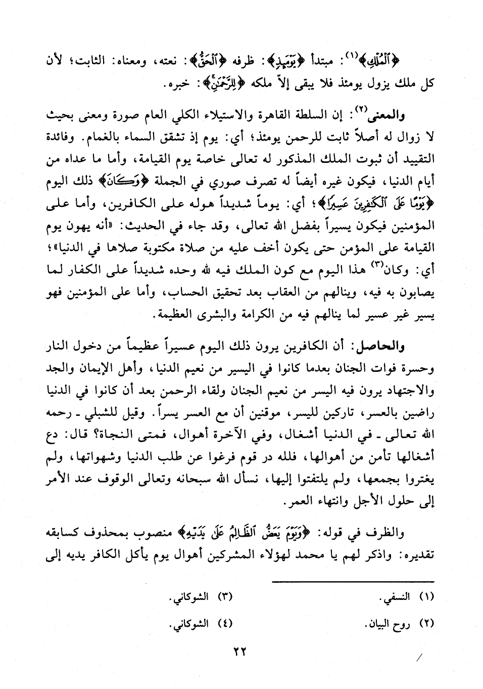 26 - {الْمُلْكُ} (¬1): مبتدأ {يَوْمَئِذٍ}: ظرفه {الْحَقُّ}: نعته، ومعناه: الثابت؛ لأن كل ملك يزول يومئذ فلا يبقى إلّا ملكه {لِلرَّحْمَنِ}: خبره.