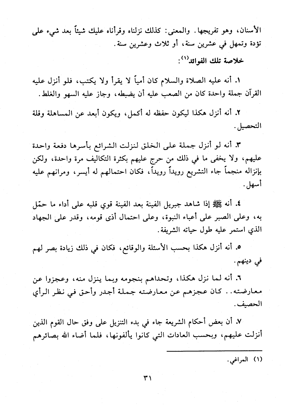 3 - أنه لو أنزل جملة على الخلق لنزلت الشرائع بأسرها دفعة واحدة عليهم، ولا يخفى ما في ذلك من حرج عليهم بكثرة التكاليف مرة واحدة، ولكن بإنزاله منجمًا جاء التشريع رويدًا رويدًا، فكان احتمالهم له أيسر، ومرانهم عليه أسهل.