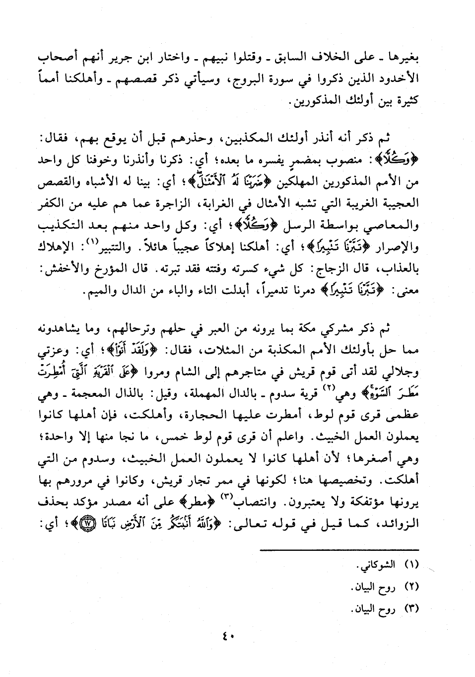 39 - ثم ذكر أنه أنذر أولئك المكذبين، وحذرهم قبل أن يوقع بهم، فقال: {وَكُلًّا}: منصوب بمضمرٍ يفسره ما بعده؛ أي: ذكرنا وأنذرنا وخوفنا كل واحد من الأمم المذكورين المهلكين {ضَرَبْنَا لَهُ الْأَمْثَالَ}؛ أي: بينا له الأشباه والقصص العجيبة الغريبة التي تشبه الأمثال في الغرابة، الزاجرة عما هم عليه من الكفر والمعاصي بواسطة الرسل {وَكُلًّا}؛ أي: وكل واحد منهم بعد التكذيب والإصرار {تَبَّرْنَا تَتْبِيرًا}؛ أي: أهلكنا إهلاكًا عجيبًا هائلًا. والتتبير (¬1): الإهلاك بالعذاب، قال الزجاج: كل شيء كسرته وفتته فقد تبرته. قال المؤرخ والأخفش: معنى: {تَبَّرْنَا تَتْبِيرًا} دمرنا تدميرًا، أبدلت التاء والباء من الدال والميم.