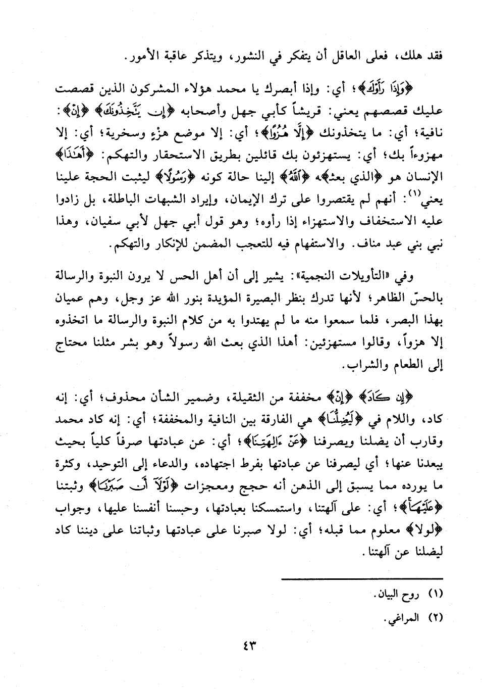 42 - {إِنْ كَادَ} {إِنْ} مخففة من الثقيلة، وضمير الشأن محذوف؛ أي: إنه كاد، واللام في {لَيُضِلُّنَا} هي الفارقة بين النافية والمخففة؛ أي: إنه كاد محمد وقارب أن يضلنا ويصرفنا {عَنْ آلِهَتِنَا}؛ أي: عن عبادتها صرفًا كليًا بحيث يبعدنا عنها؛ أي ليصرفنا عن عبادتها بفرط اجتهاده، والدعاء إلى التوحيد، وكثرة ما يورده مما يسبق إلى الذهن أنه حجج ومعجزات {لَوْلَا أَنْ صَبَرْنَا} وثبتنا {عَلَيْهَا}؛ أي: على آلهتنا، واستمسكنا بعبادتها، وحبسنا أنفسنا عليها، وجواب {لولا} معلوم مما قبله؛ أي: لولا صبرنا على عبادتها وثباتنا على ديننا كاد ليضلنا عن آلهتنا.