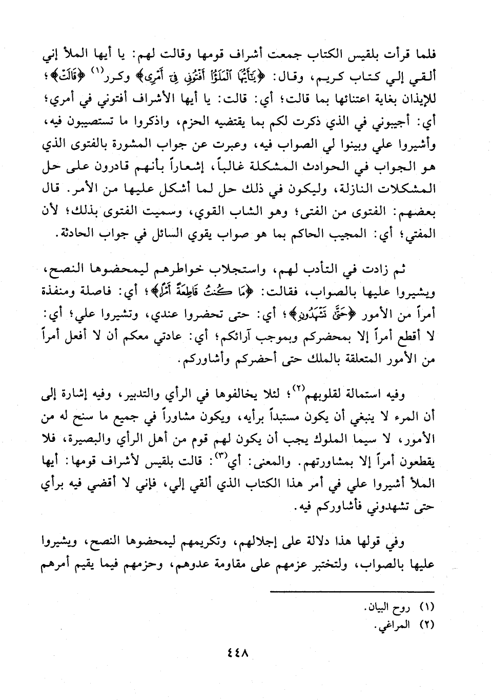 وفي قولها هذا دلالة على إجلالهم، وتكريمهم ليمحضوها النصح، ويشيروا عليها بالصواب، ولتختبر عزمهم على مقاومة عدوهم، وحزمهم فيما يقيم أمرهم