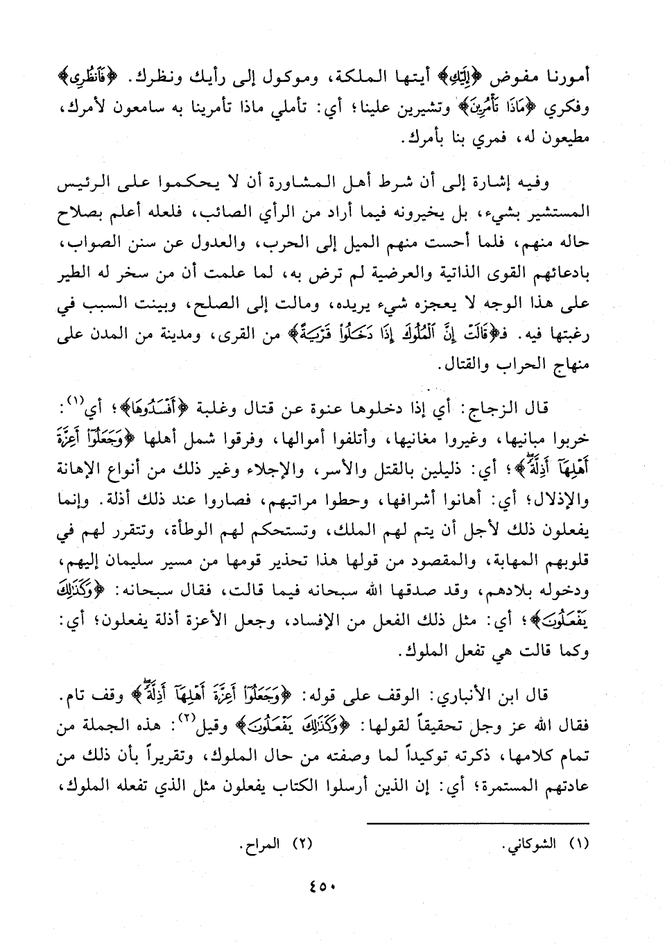 قال ابن الأنباري: الوقف على قوله: {وَجَعَلُوا أَعِزَّةَ أَهْلِهَا أَذِلَّةً} وقف تام. فقال الله عَزَّ وَجَلَّ تحقيقًا لقولها: {وَكَذَلِكَ يَفْعَلُونَ} وقيل (¬2): هذه الجملة من تمام كلامها، ذكرته توكيدًا لما وصفته من حال الملوك، وتقريرًا بأن ذلك من عادتهم المستمرة؛ أي: إن الذين أرسلوا الكتاب يفعلون مثل الذي تفعله الملوك،