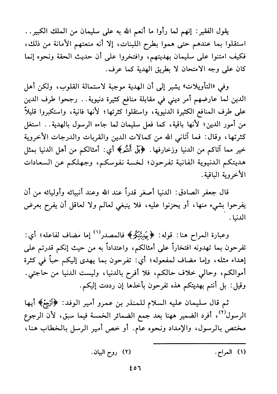 وفي "التأويلات" يشير إلى أن الهدية موجبة لاستمالة القلوب، ولكن أهل الدين لما عارضهم أمر ديني في مقابلة منافع كثيرة دنيوية .. رجحوا طرف الدين على طرف المنافع الكثيرة الدنيوية، واستقلوا كثرتها؛ لأنها فانية، واستكبروا قليلًا من أمور الدين؛ لأنها باقية، كما فعل سليمان لما جاءه الرسول بالهدية .. استغل كثرتها، وقال: فما آتاني الله من كمالات الدين والقربات والدرجات الأخروية خير مما آتاكم من الدنيا وزخارفها. {بَلْ أَنْتُمْ}: أمثالكم من أهل الدنيا بمثل هديتكم الدنيوية الفانية تفرحون؛ لخسة نفوسكم، وجهلكم عن السعادات الأخروية الباقية.