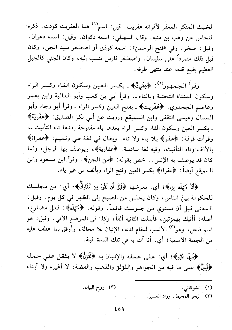وقرأ الجمهور (¬2): {عِفْرِيتٌ} - بكسر العين وسكون الفاء وكسر الراء وسكون المثناة التحتية وبالتاء -، وقرأ أبي بن كعب وأبو العالية وابن يعمر وعاصم الجحدري: {عَفْريت} - بفتح العين وكسر الراء - وقرأ أبو رجاء وأبو السمال وعيسى الثقفي وابن السميقع ورويت عن أبي بكر الصديق: {عَفْريَة} - بكسر العين وسكون الفاء وكسر الراء بعدها ياء مفتوحة بعدها تاء التأنيث -، وقرأت فرقة: {عفر} بلا ياء ولا تاء. ويقال في لغة طي وتميم: {عفراة} بالألف وتاء التأنيث، وفيه لغة سادسة: {عفارية} ويوصف بها الرجل، ولما كان قد يوصف به الإنس .. خص بقوله: {مِنَ الْجِنِّ}. وقرأ ابن مسعود وابن السميقع أيضًا: {عفراة} بكسر العين وفتح الراء وبالف من غير ياء.