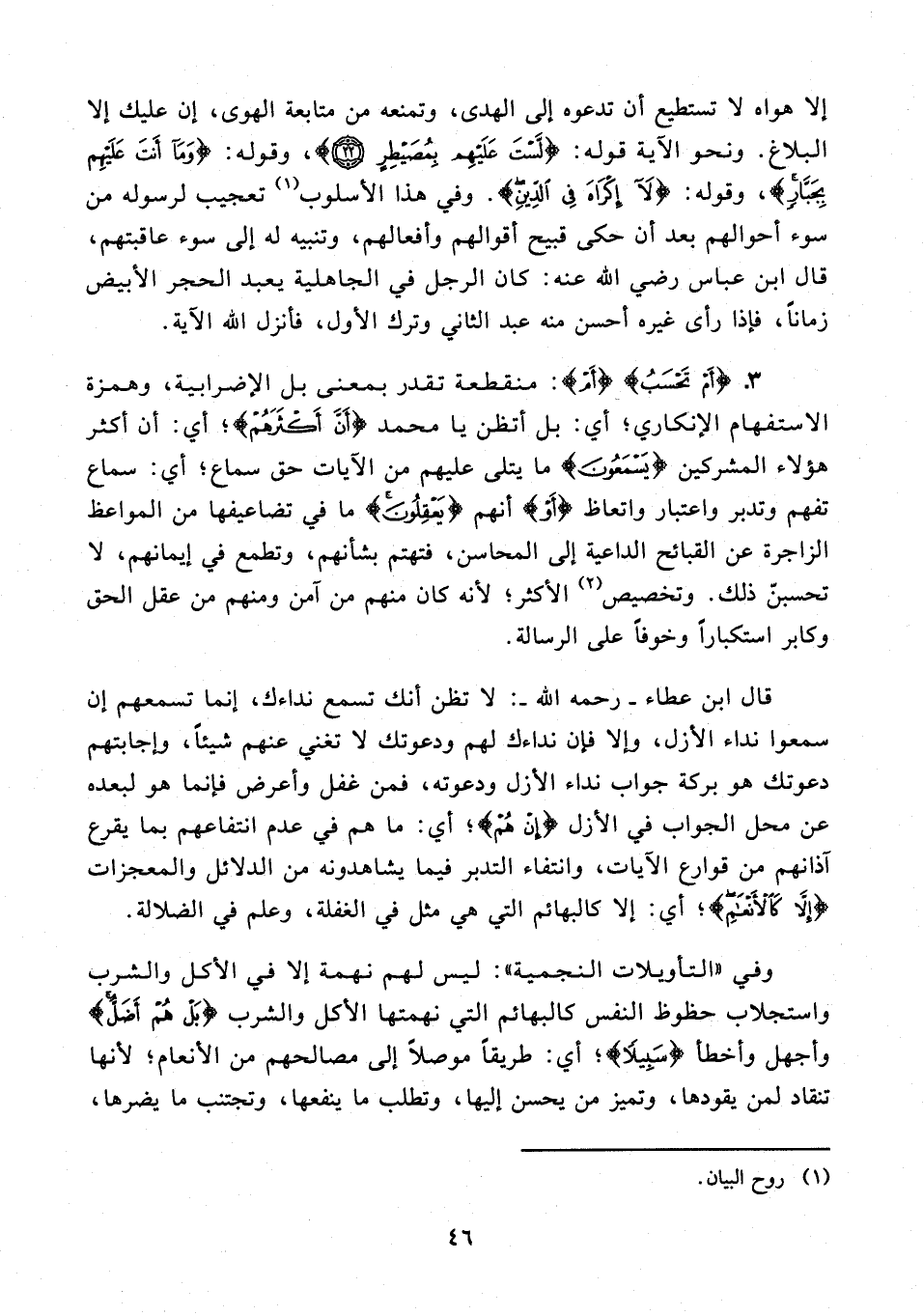 3 - 44 {أَمْ تَحْسَبُ} {أَمْ}: منقطعة تقدر بمعنى بل الإضرابية، وهمزة الاستفهام الإنكاري؛ أي: بل أتظن يا محمد {أَنَّ أَكْثَرَهُمْ}؛ أي: أن أكثر هؤلاء المشركين {يَسْمَعُونَ} ما يتلى عليهم من الآيات حق سماع؛ أي: سماع تفهم وتدبر واعتبار واتعاظ {أَوْ} أنهم {يَعْقِلُونَ} ما في تضاعيفها من المواعظ الزاجرة عن القبائح الداعية إلى المحاسن، فتهتم بشأنهم، وتطمع في إيمانهم، لا تحسبنّ ذلك. وتخصيص (¬2) الأكثر؛ لأنه كان منهم من آمن ومنهم من عقل الحق وكابر استكبارًا وخوفًا على الرسالة.