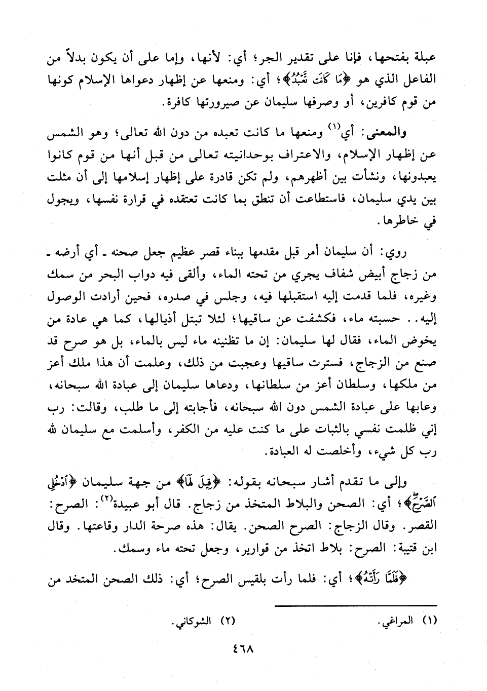 عبلة بفتحها، فإنا على تقدير الجر؛ أي: لأنها، وإما على أن يكون بدلًا من الفاعل الذي هو {مَا كَانَتْ تَعْبُدُ}؛ أي: ومنعها عن إظهار دعواها الإِسلام كونها من قوم كافرين، أو وصرفها سليمان عن صيرورتها كافرة.