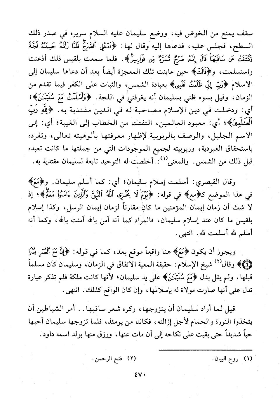 وقال القيصري: أسلمت إسلام سليمان؛ أي: كما أسلم سليمان. و {مَعَ} في هذا الموضع كـ {مع} في قوله: {يَوْمَ لَا يُخْزِي اللَّهُ النَّبِيَّ وَالَّذِينَ آمَنُوا مَعَهُ}؛ إذ لا شك أن زمان إيمان المؤمنين ما كان مقارنًا لزمان إيمان الرسل، وكذا إسلام بلقيس ما كان عند إسلام سليمان، فالمراد كما أنه آمن بالله آمنت بالله، وكما أنه أسلم لله أسلمت لله. انتهى.