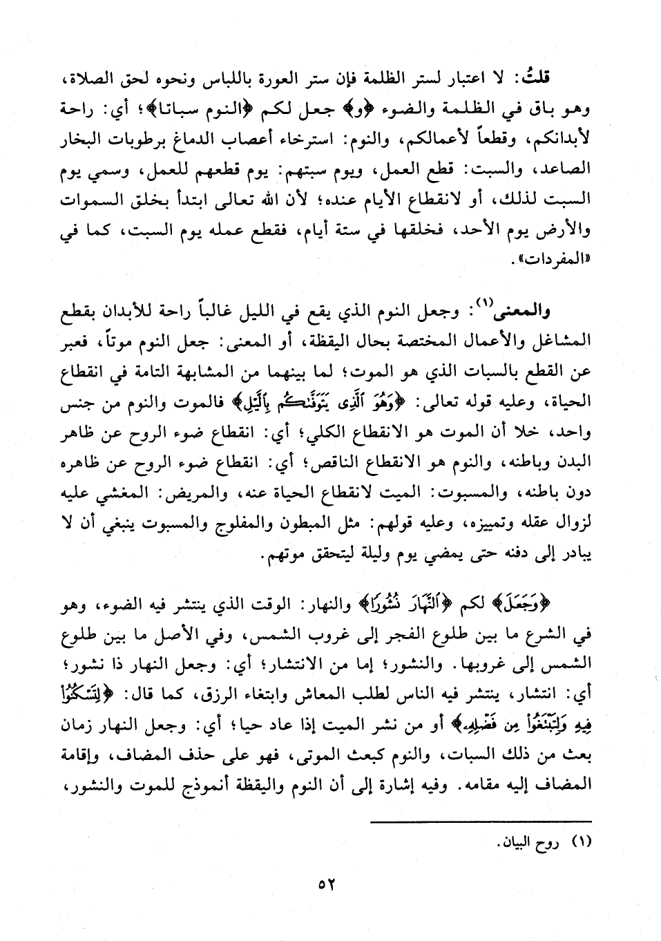 والمعنى (¬1): وجعل النوم الذي يقع في الليل غالبًا راحة للأبدان بقطع المشاغل والأعمال المختصة بحال اليقظة، أو المعنى: جعل النوم موتًا، فعبر عن القطع بالسبات الذي هو الموت؛ لما بينهما من المشابهة التامة في انقطاع الحياة، وعليه قوله تعالى: {وَهُوَ الَّذِي يَتَوَفَّاكُمْ بِاللَّيْلِ} فالموت والنوم من جنس واحد، خلا أن الموت هو الانقطاع الكلي؛ أي: انقطاع ضوء الروح عن ظاهر البدن وباطنه، والنوم هو الانقطاع الناقص؛ أي: انقطاع ضوء الروح عن ظاهره دون باطنه، والمسبوت: الميت لانقطاع الحياة عنه، والمريض: المغشي عليه لزوال عقله وتمييزه، وعليه قولهم: مثل المبطون والمفلوج والمسبوت ينبغي أن لا يبادر إلى دفنه حتى يمضي يوم وليلة ليتحقق موتهم.